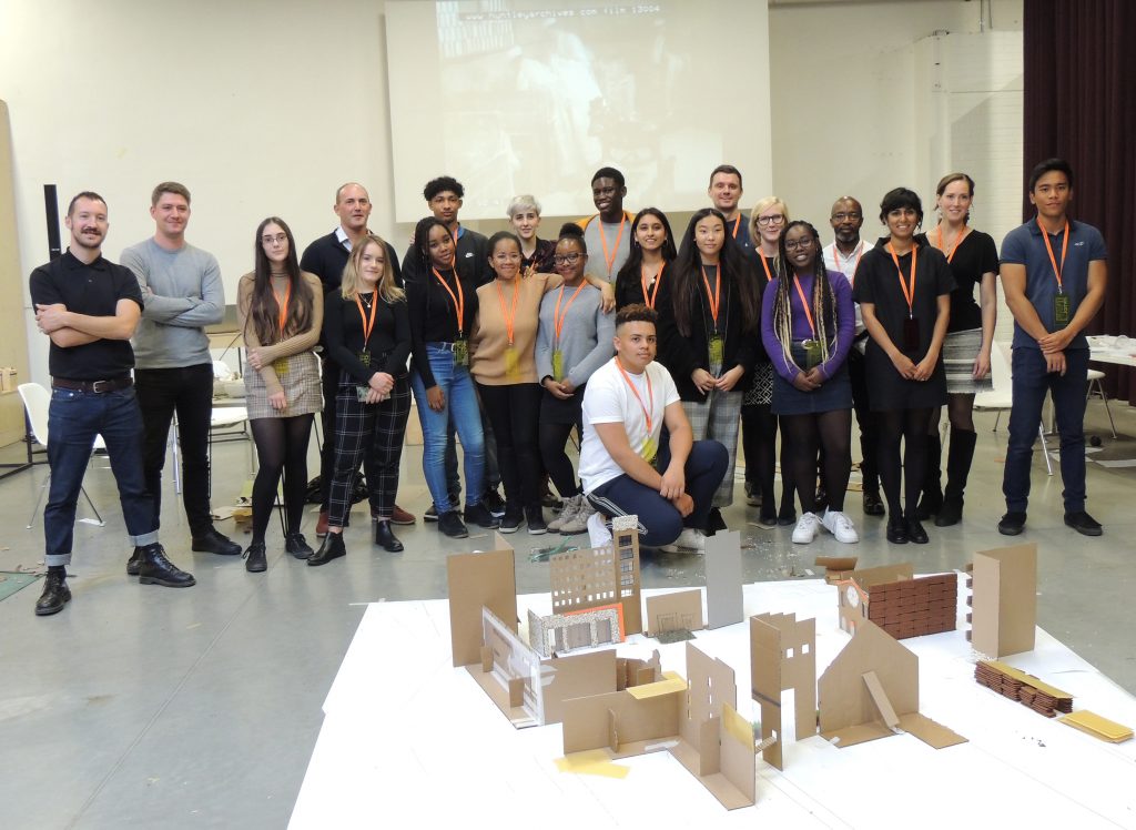 13 A-level students from Graveney School and Neil Pinder from Homegrown Plus took part in a hands-on architectural workshop where students made a large-scale model of our offices and the surrounding site. Students were given a short history of the practice and the Biscuit Factory where our offices currently reside and divided into teams to survey the surrounding area and gather research materials; photos, sketches and pencil rubbings. In the afternoon, students created a site model out of unconventional materials.