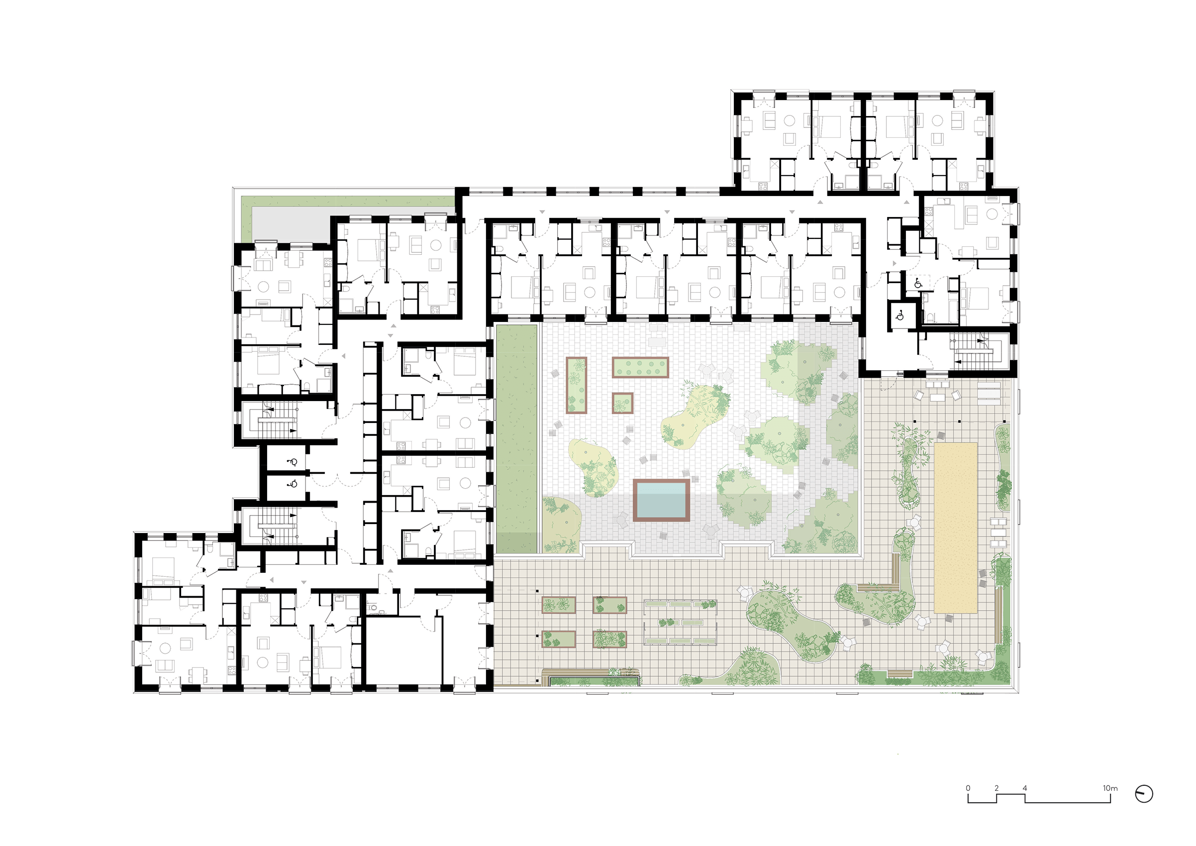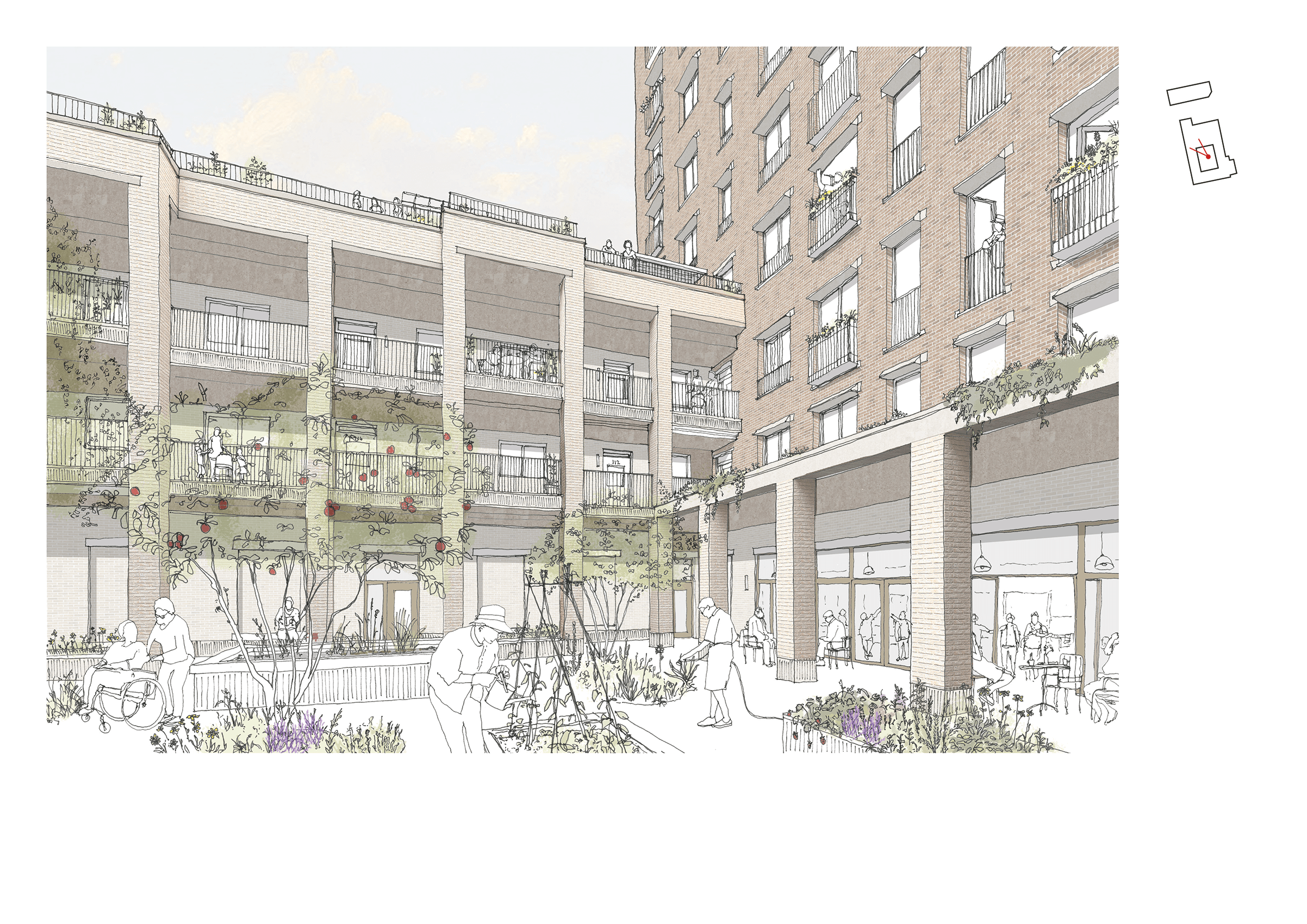 Around these civic buildings in the masterplan, new mixed-use housing delivers 567 affordable and private homes with community spaces and age-friendly facilities integrated at ground level.