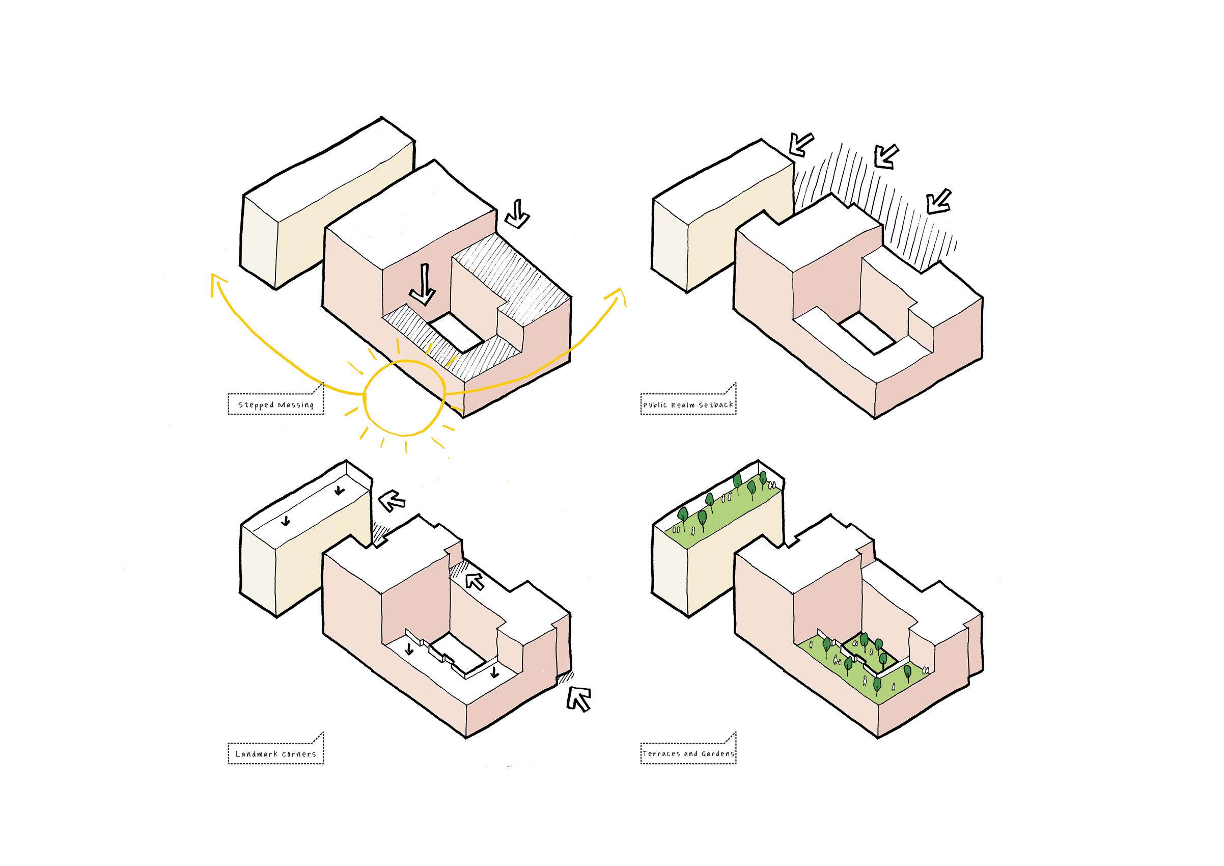 The architectural language across the masterplan reflects Basildon’s heritage while responding to the town’s current needs. Building heights are capped at twelve stories, stepping down around St Martin’s Square and the Millenium Bell Tower to protect local views. Residential buildings adopt a more subtle palette of brick and metal, with variations defining individual plots while maintaining a cohesive townscape. Active frontages at street level accommodate shops, cafes and community spaces, animating streets and creating a social, inclusive town centre and diversifying the offer of ‘doorstep’ activities for residents and visitors alike.