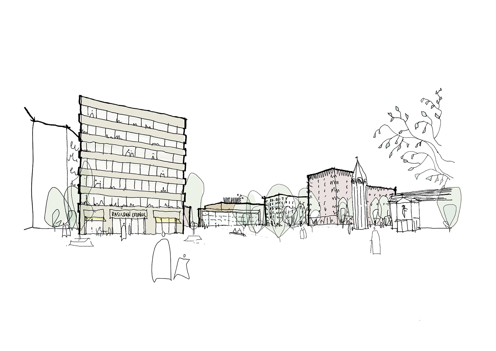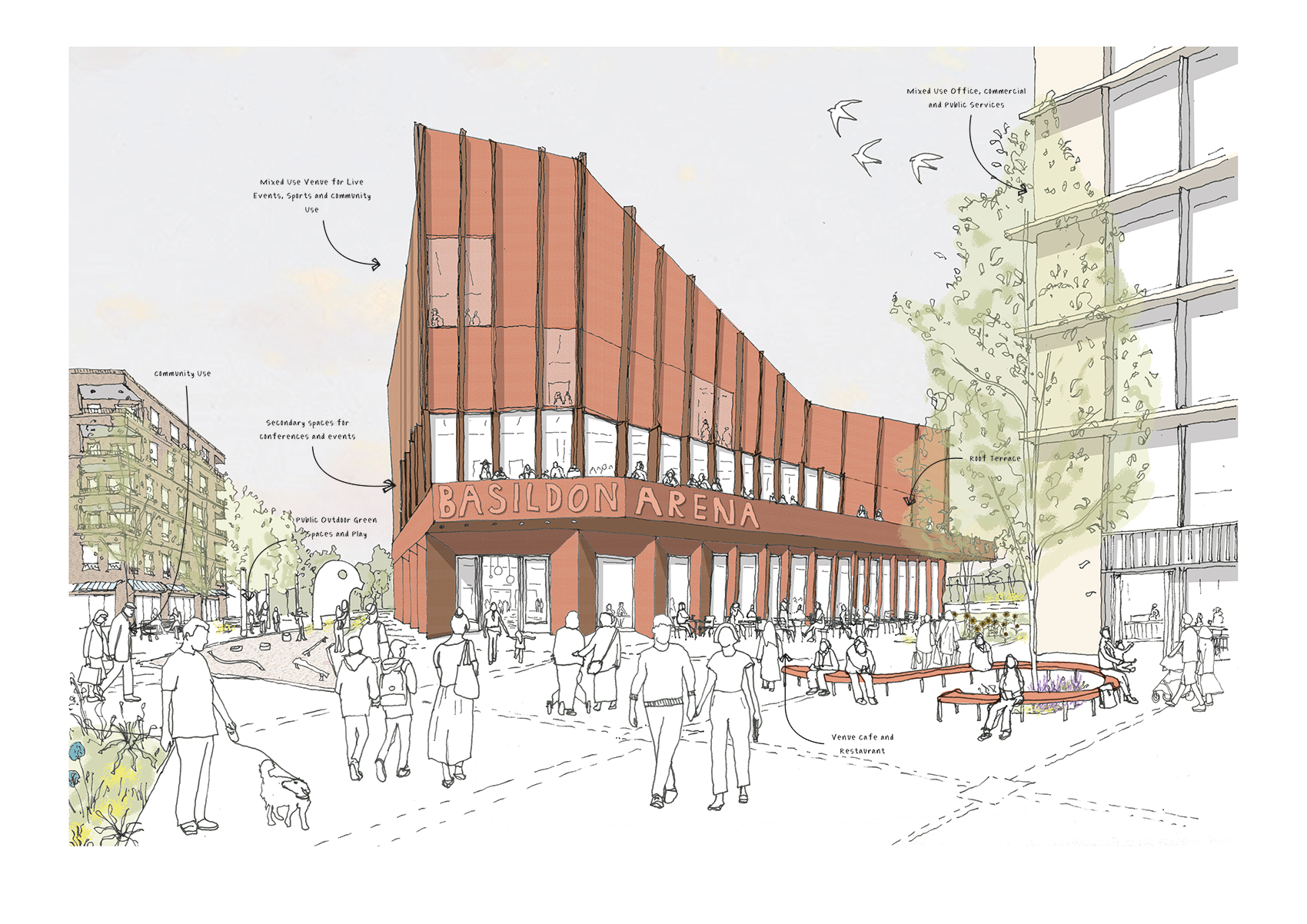 A series of key buildings and new civic spaces anchor the masterplan arrangement. At its core, a new cultural and leisure venue forms a landmark destination, providing a 3,500-person auditorium, flexible commercial space facing onto a new public square, its distinctive butterfly roof referencing Basildon’s heritage. Nearby, a new mixed-use civic hub brings together public services, healthcare and workspace under one roof. This new ‘Central Hub’ is placed in a highly accessible location with local bus and train services within walking distance, supporting the overall masterplan vision to make Basildon easier to navigate by foot, bike and public transport.