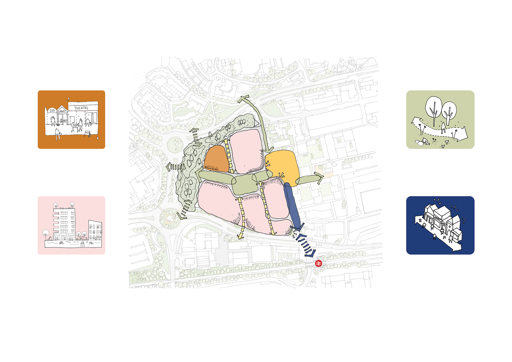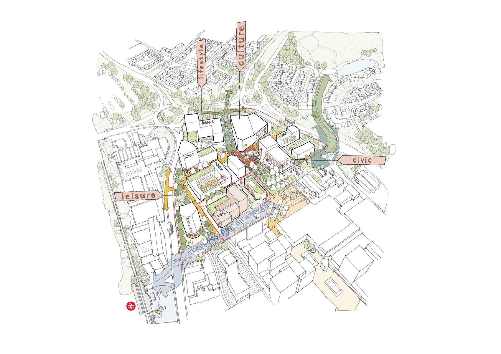A redefined public realm will connect a series of landscaped squares, pocket green spaces and active streets that invite people to dwell, play and socialise. Improved routes and generous walkways strengthen the connections to Gloucester Park and the town’s western green edge. A significant part of the urban strategy sets out a coherent street hierarchy which will limit vehicles to the masterplan edges, prioritising pedestrians and cyclists over vehicles, and reinstating the pedestrian-friendly ethos of the original New Town. In addition, a new urban park is proposed, introducing more space for play and community activity, offering a verdant contrast to Basildon’s urban fabric and re-embedding nature at the centre of daily life.
