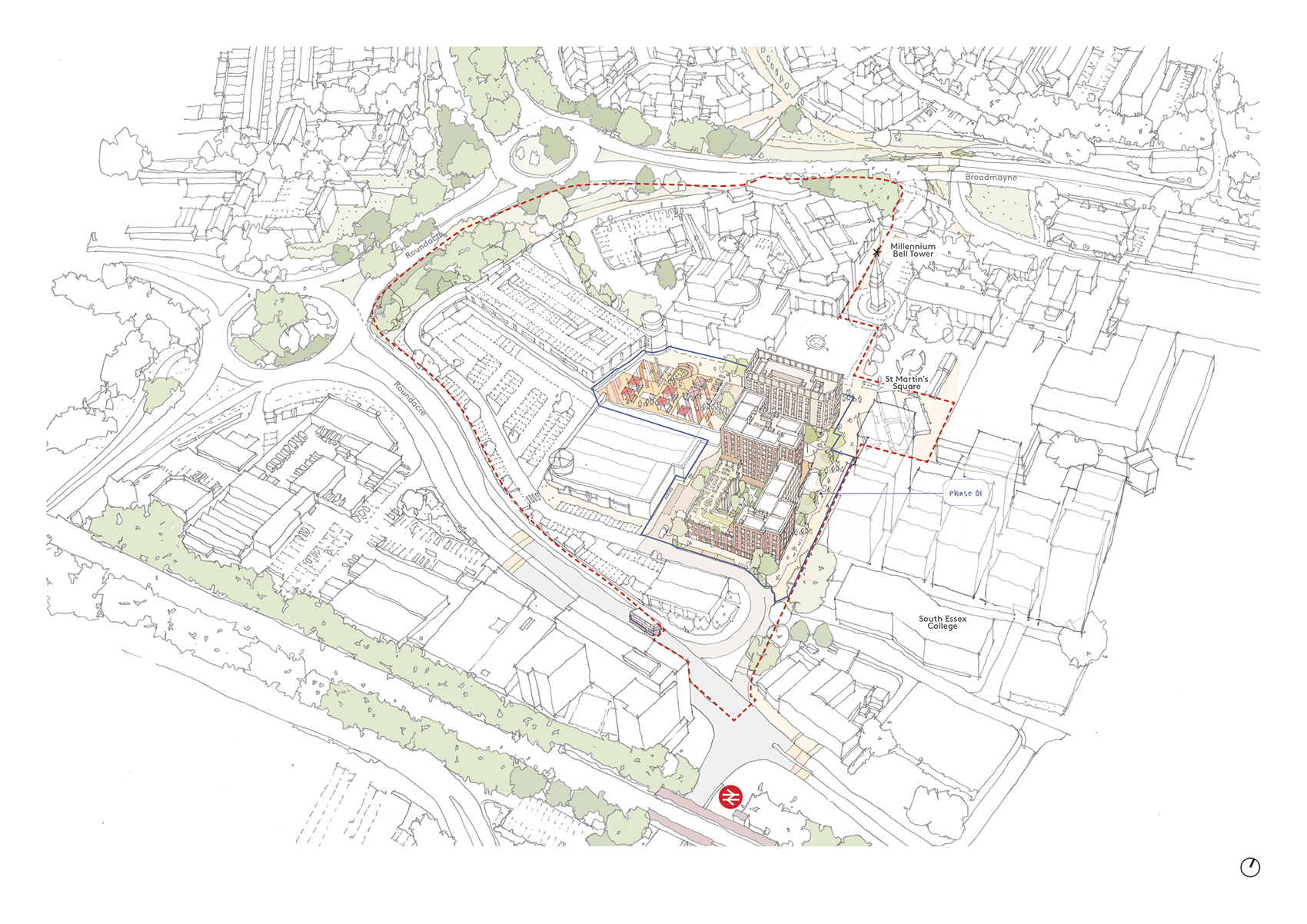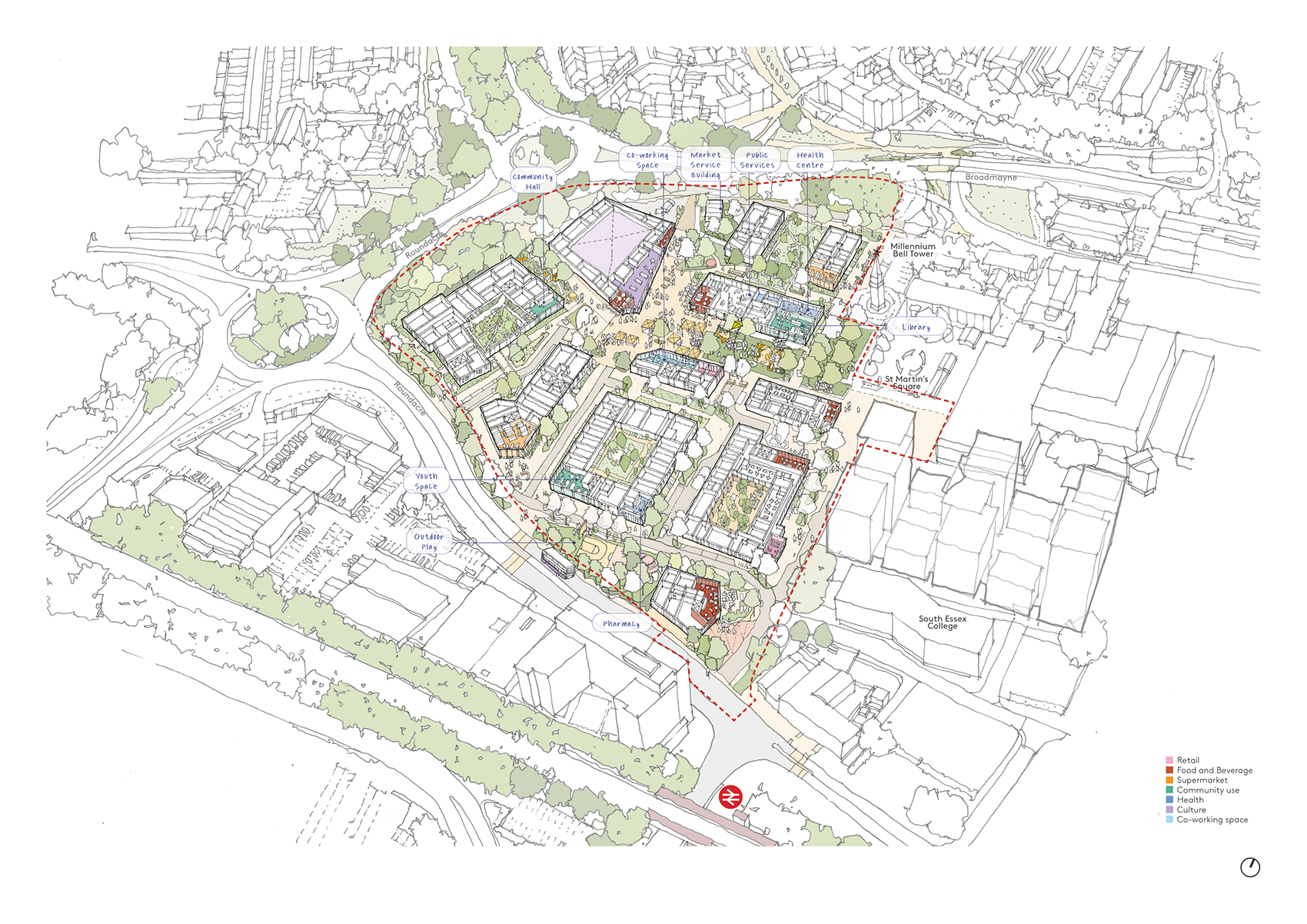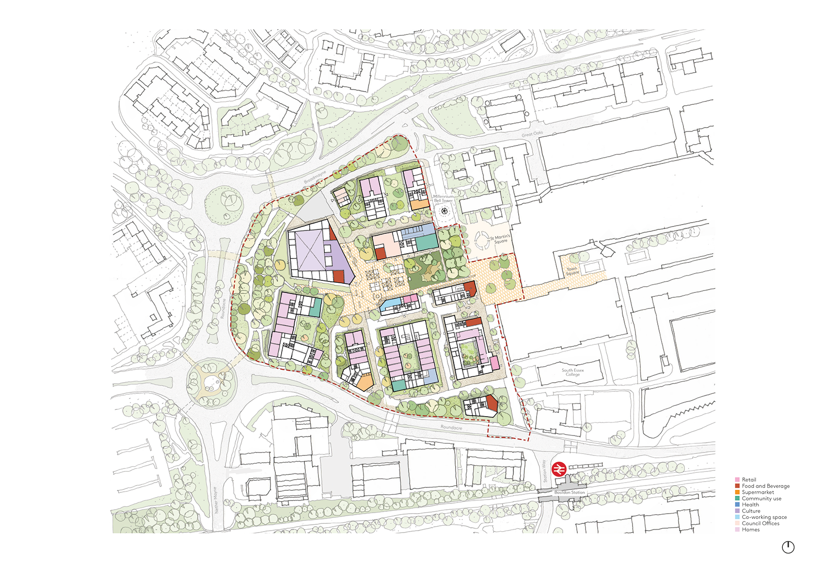 The Basildon Westgate Masterplan sets out a 20-year framework to reimagine the western edge of Basildon’s town centre, shaped by guiding principles drawn through ongoing engagement with residents and stakeholders. Basildon was one of England’s first New Towns, established in the 1950’s and celebrated for its progressive civic design and structured urban layout. Today however, the western edge presents a fragmented townscape, with under-occupied retail units, unclear pedestrian routes and extensive surface level parking detracting from cultural and historic assets including St Martin’s Square and The Millenium Bell Tower.