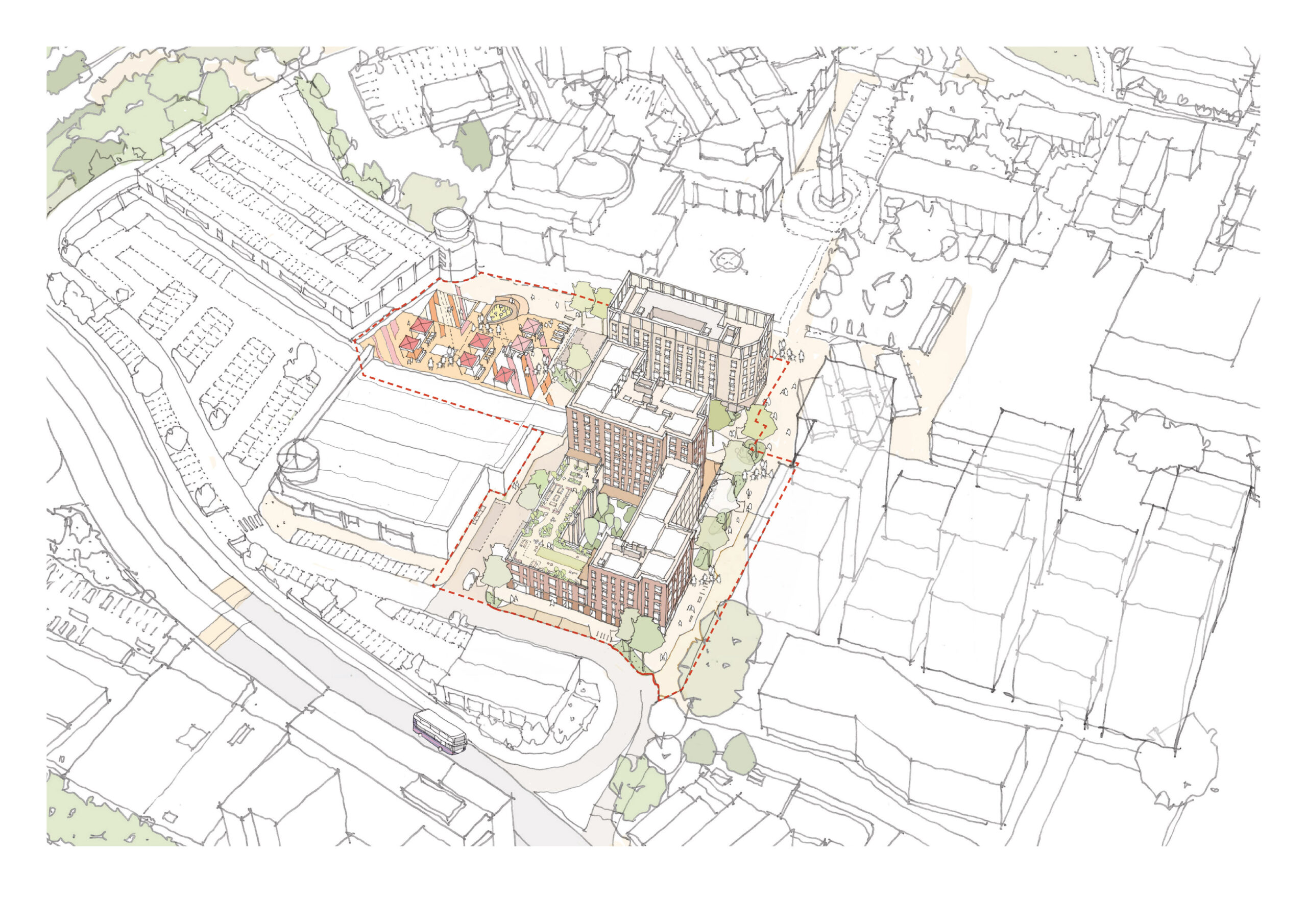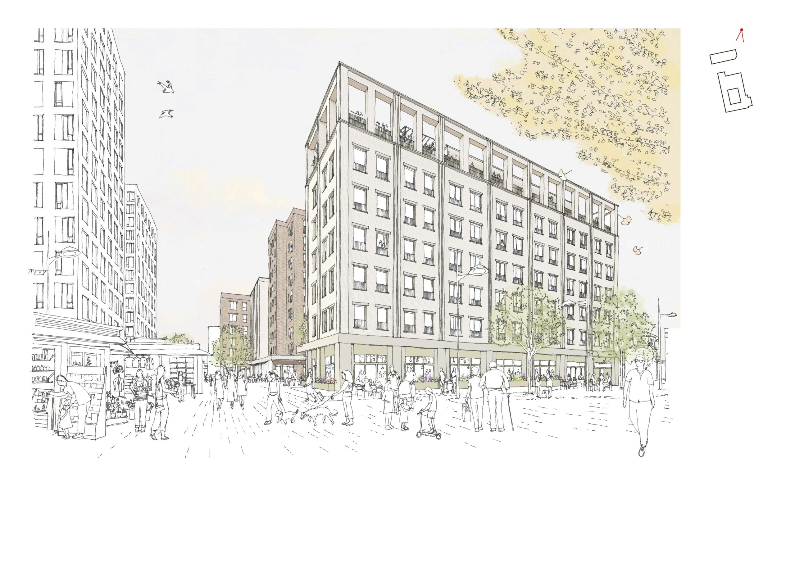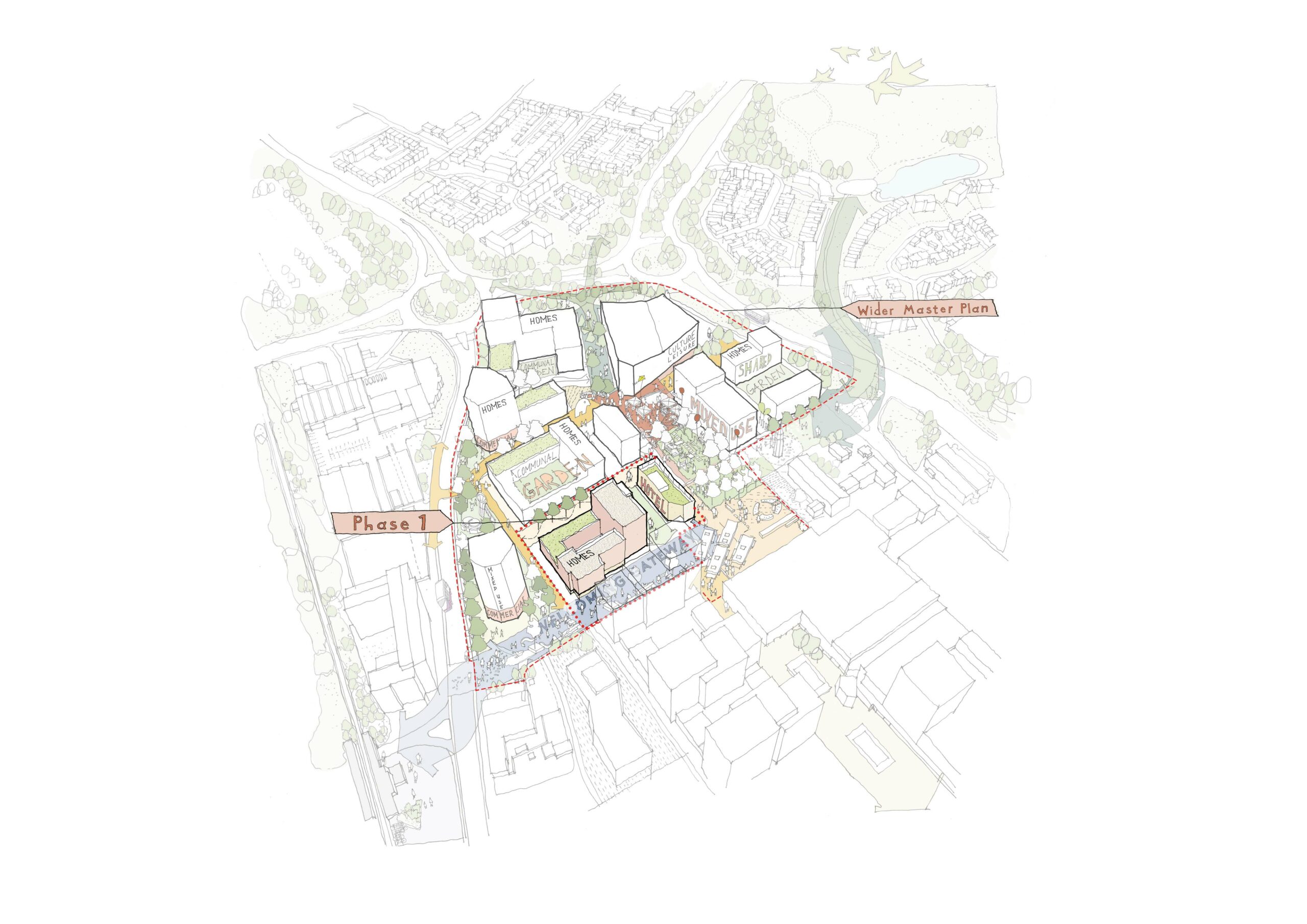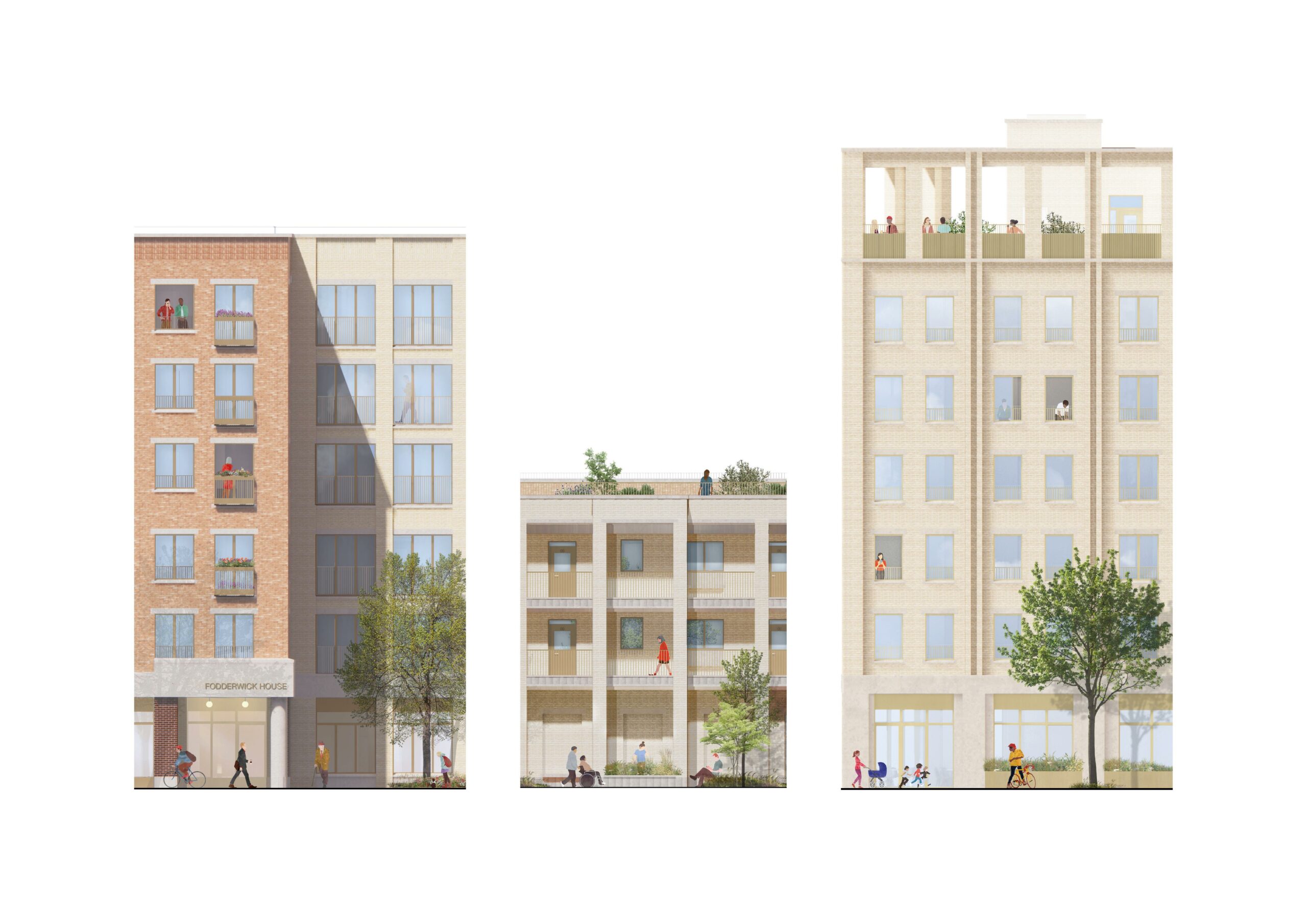 Community and stakeholder engagement played a central role throughout the design process, informing a guiding set of principles and shaping the project’s direction. Conversations with residents and stakeholders highlighted key priorities that would respond to local needs and aspirations. This led to design decisions that focused on improving connections between the Town Square and Fodderwick, expanding green spaces, providing new homes with generous amenity space and introducing new commercial uses within the Town Centre.