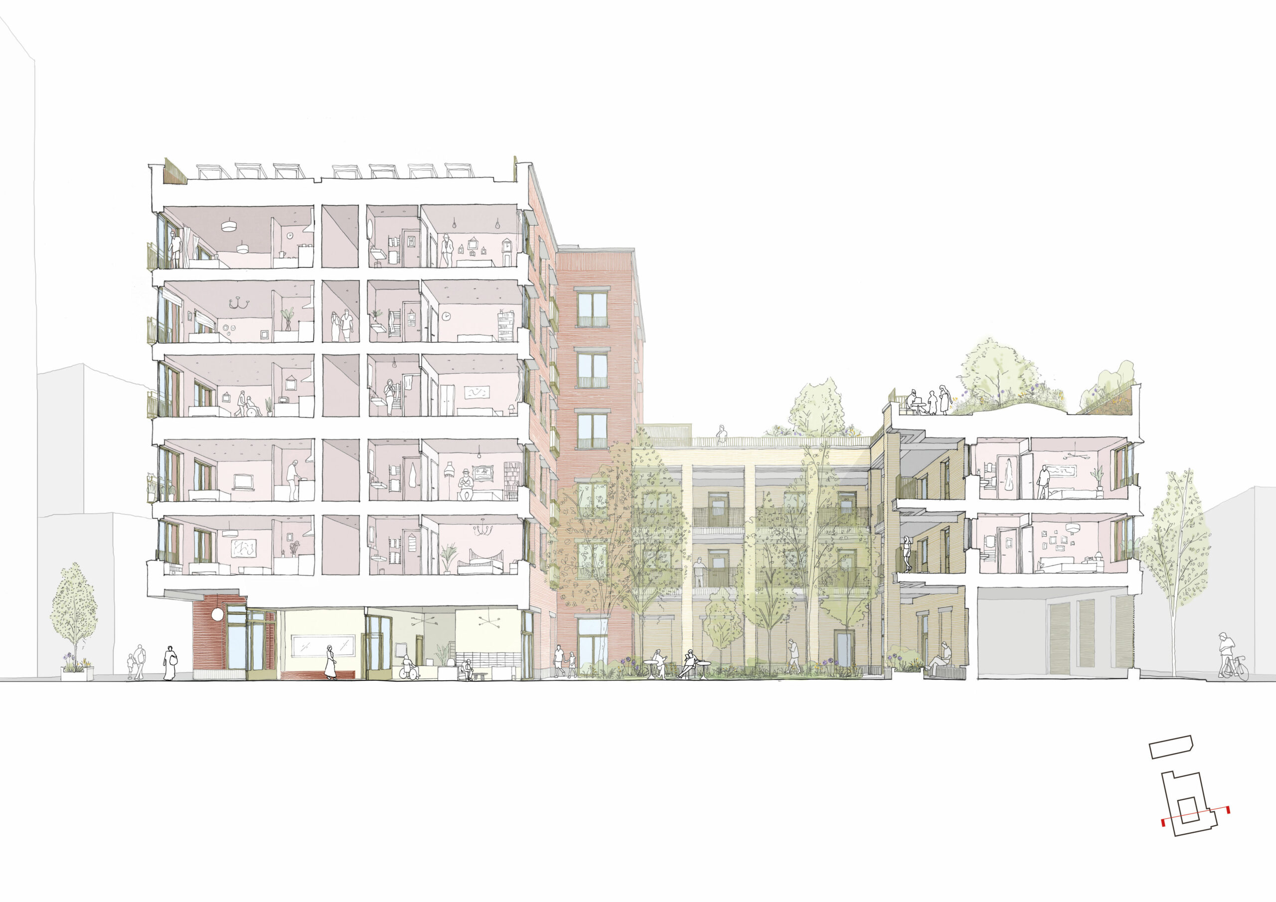 Acting as the gateway to the Town Centre and St Martin’s Square, a new 3 to 9 storey Extra-Care building will sit to the south of the site, now given to pedestrian priority, marked by trees, rain gardens and seating. A glazed brick entrance leads into a lobby and residents’ lounge, and onto a shared courtyard. The integration of quiet outdoor spaces into the building’s plan is continued onto the third-floor terrace, with a greenhouse, raised-bed allotments, shaded canopies and areas for exercise and interaction.