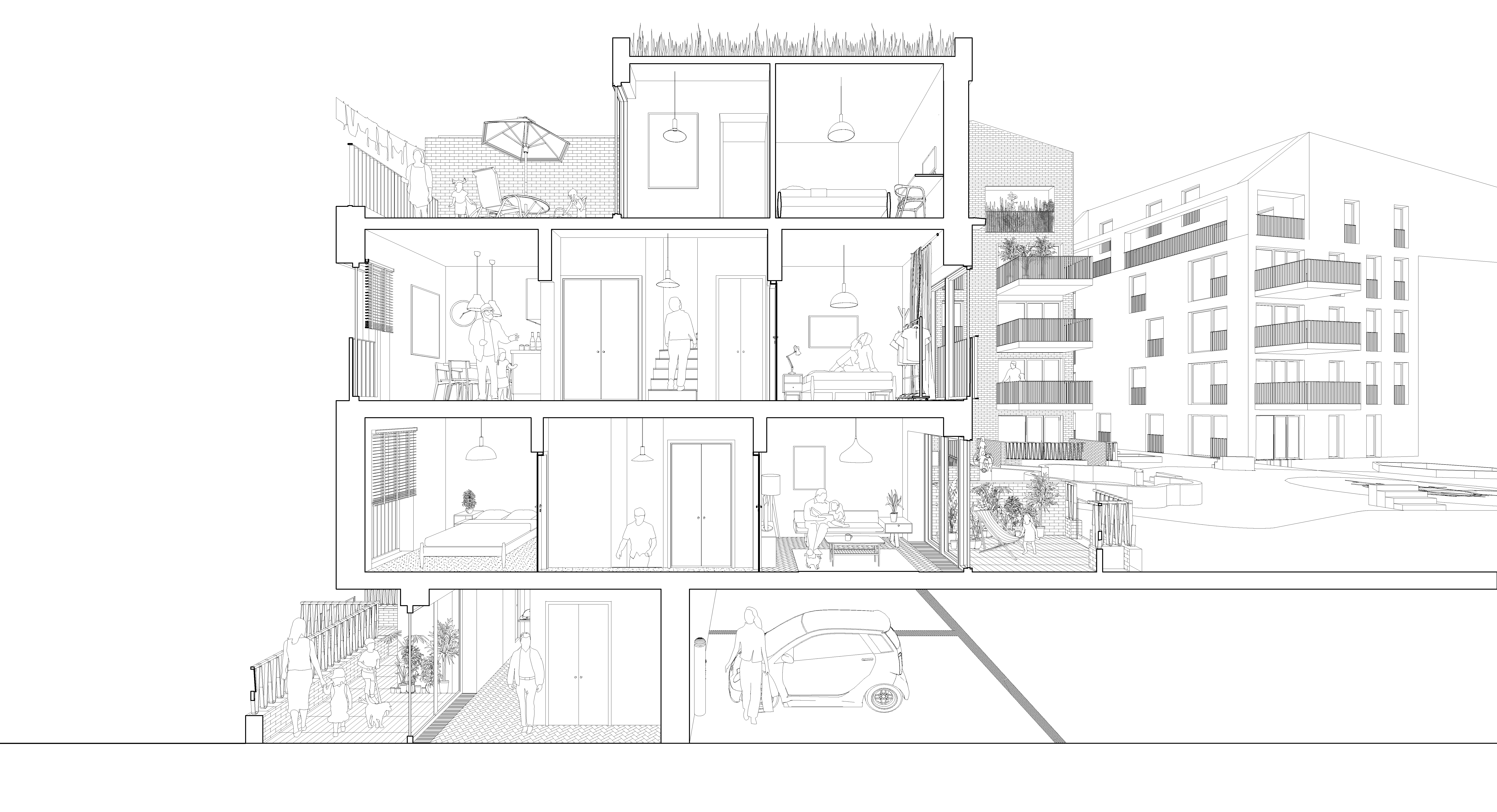 To the south, the building line is broken down into smaller elements to form a residential terrace of homes lining Colville Street. Lowering the building heights in this way ensures light is optimised into the shared courtyard space, residential back gardens and terraces. Spacious dwellings wrap around the outdoor communal courtyard, with gated back gardens opening out to a raised landscape element to create an environment which encourages connections between neighbours.