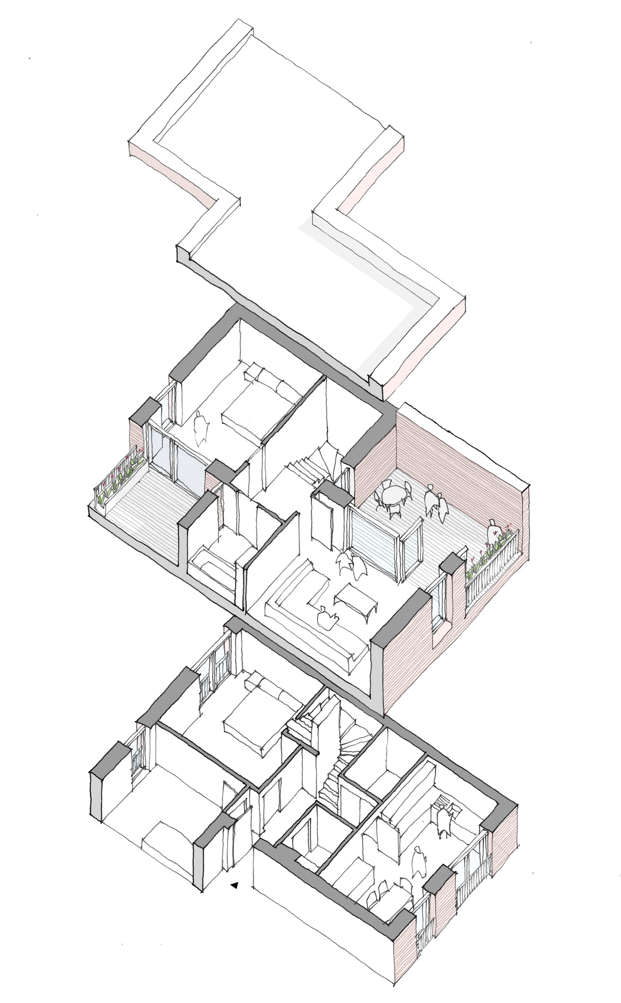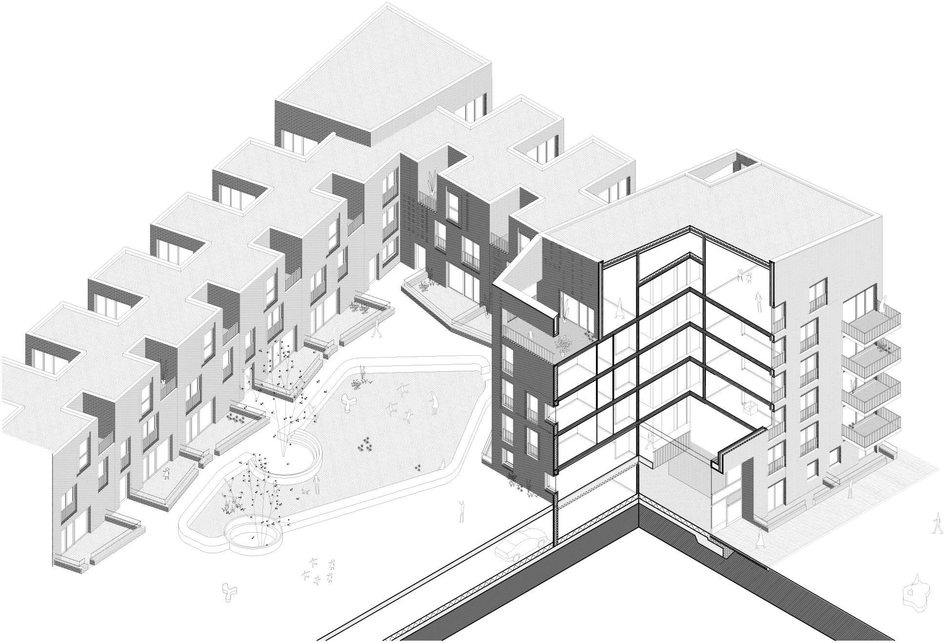 To the east is Clift House, a courtyard building fronting Branch Place that features a raised landscaped garden with carparking underneath. In response to its different edge conditions, massing is varied.