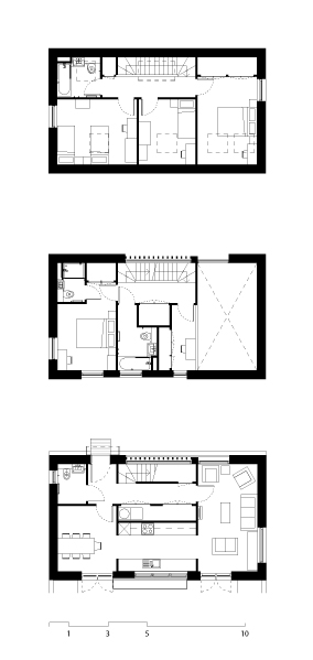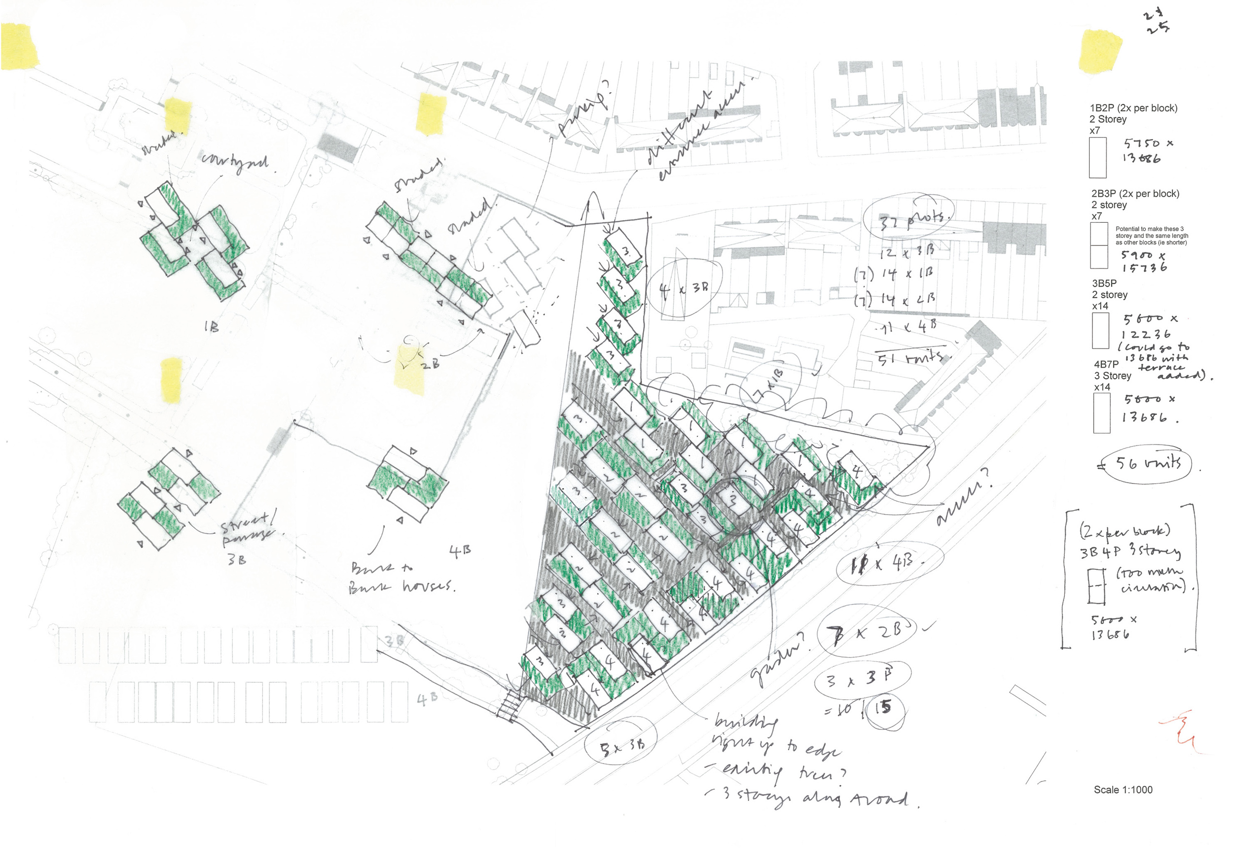 The location of the scheme on Metropolitan Open Land (MOL), as designated by the GLA, required a thoughtful approach in order to retain views and a sense of openness through the site. In response, homes are off-set from one another to form a staggered patchwork arrangement, with dwellings organised between gardens and vehicular yards in a pattern that mimics the layout of nearby allotments.