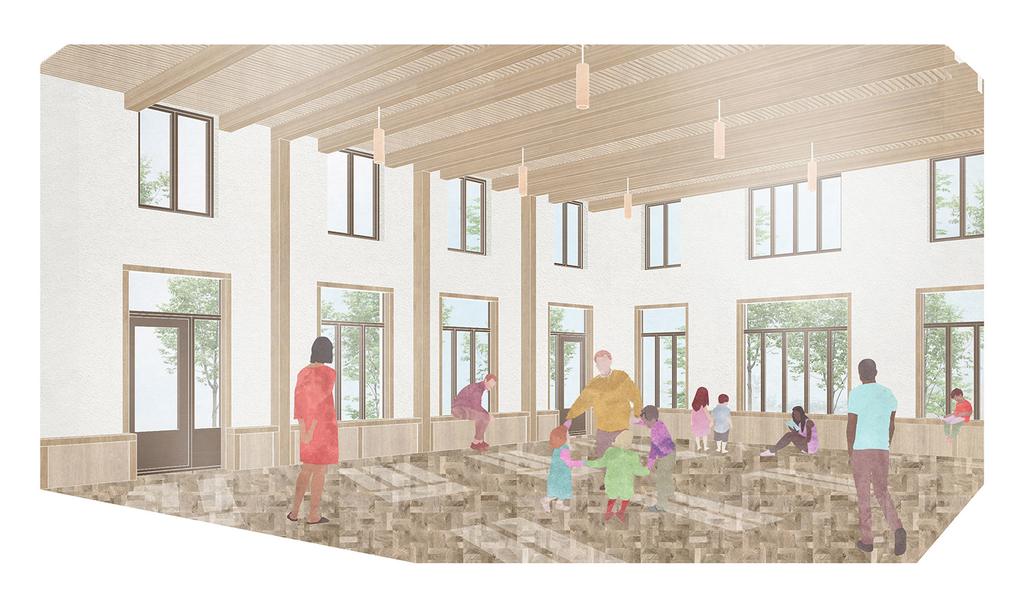 At its east side, at the highly visible approach from the south, is the entrance to the community centre. Here the building line purposefully steps back to create a more expansive public space for people to gather. At its west side, the building tapers into the masterplan and where it meets a prominent junction is articulated by a communal entrance.