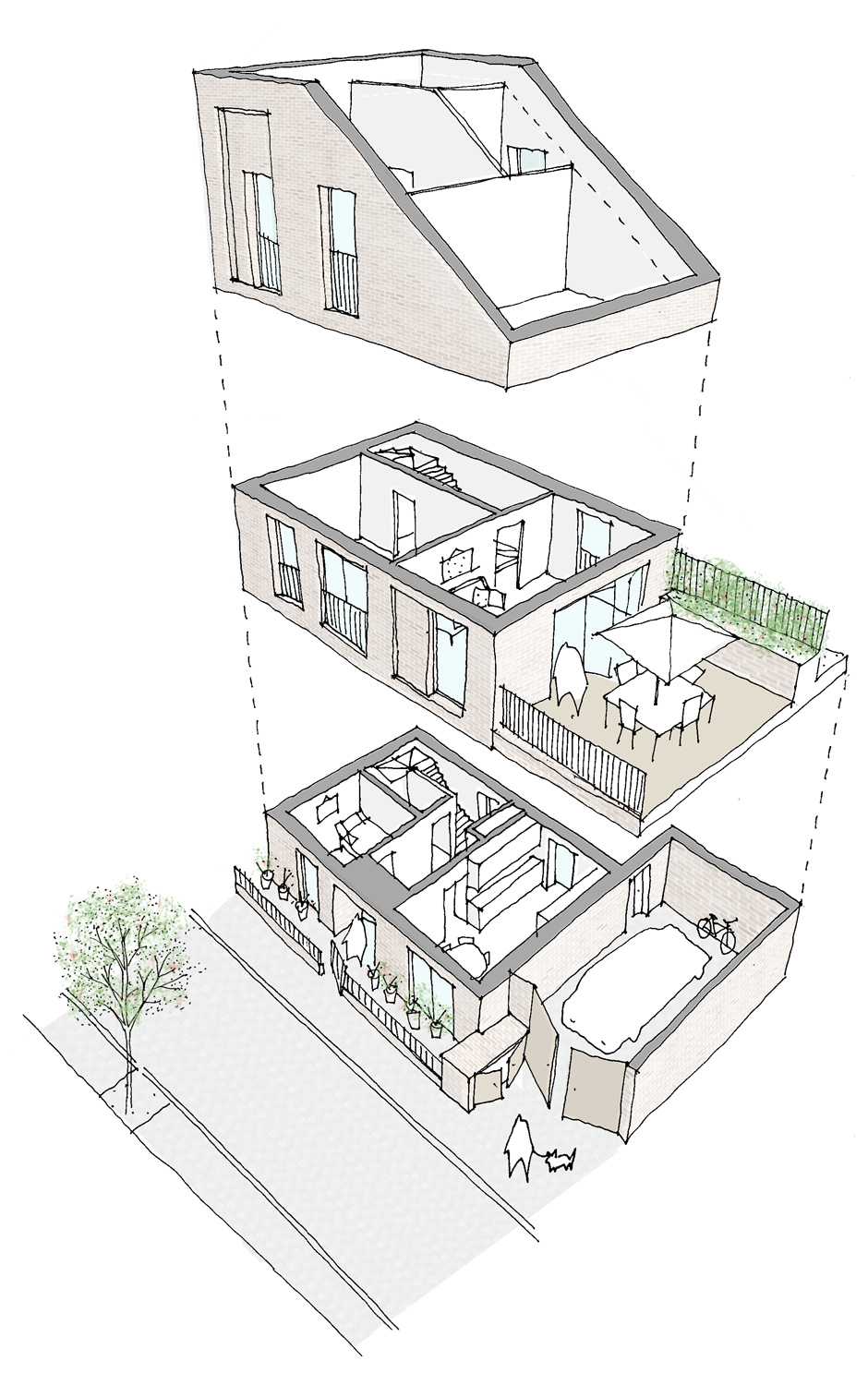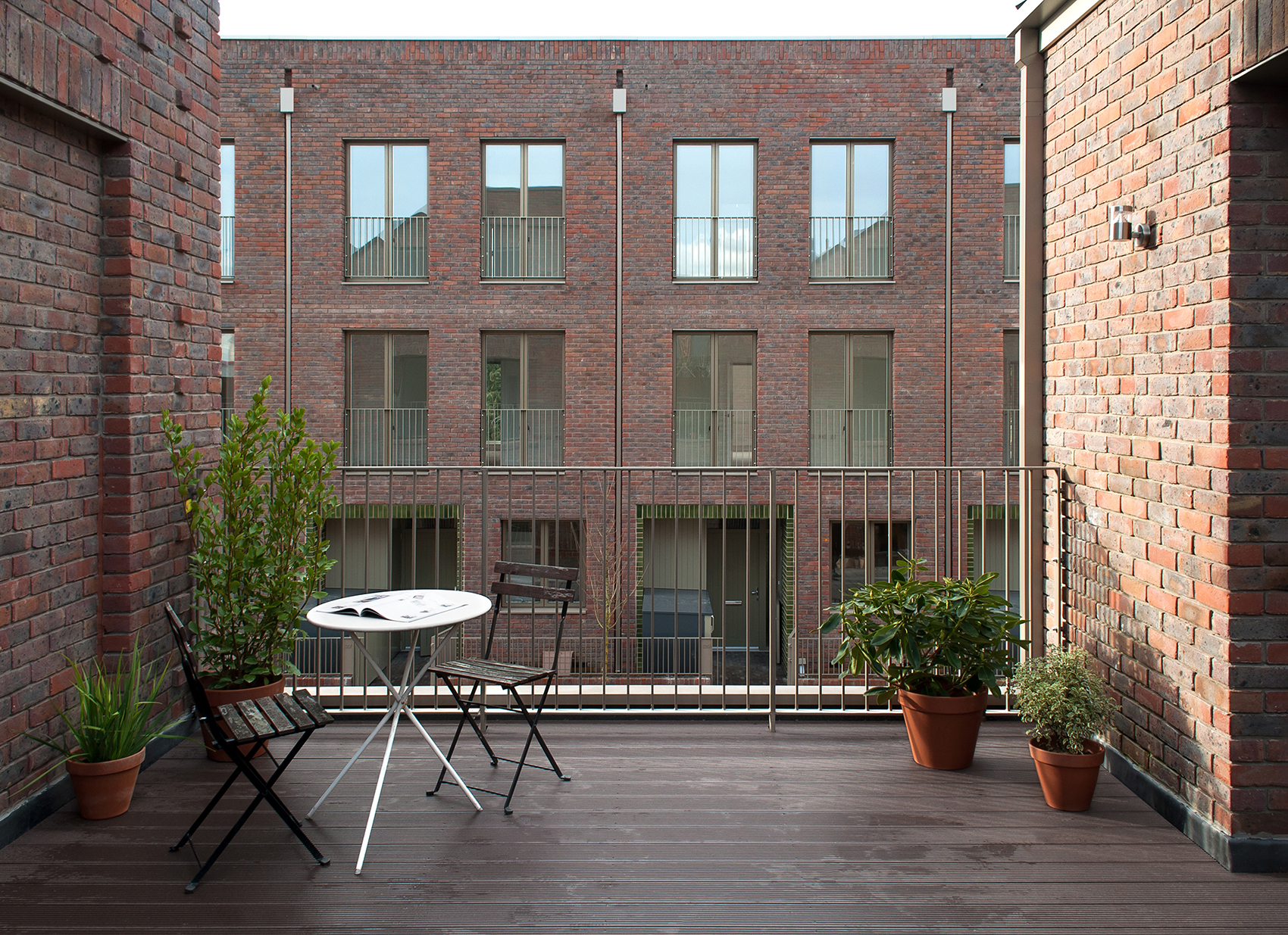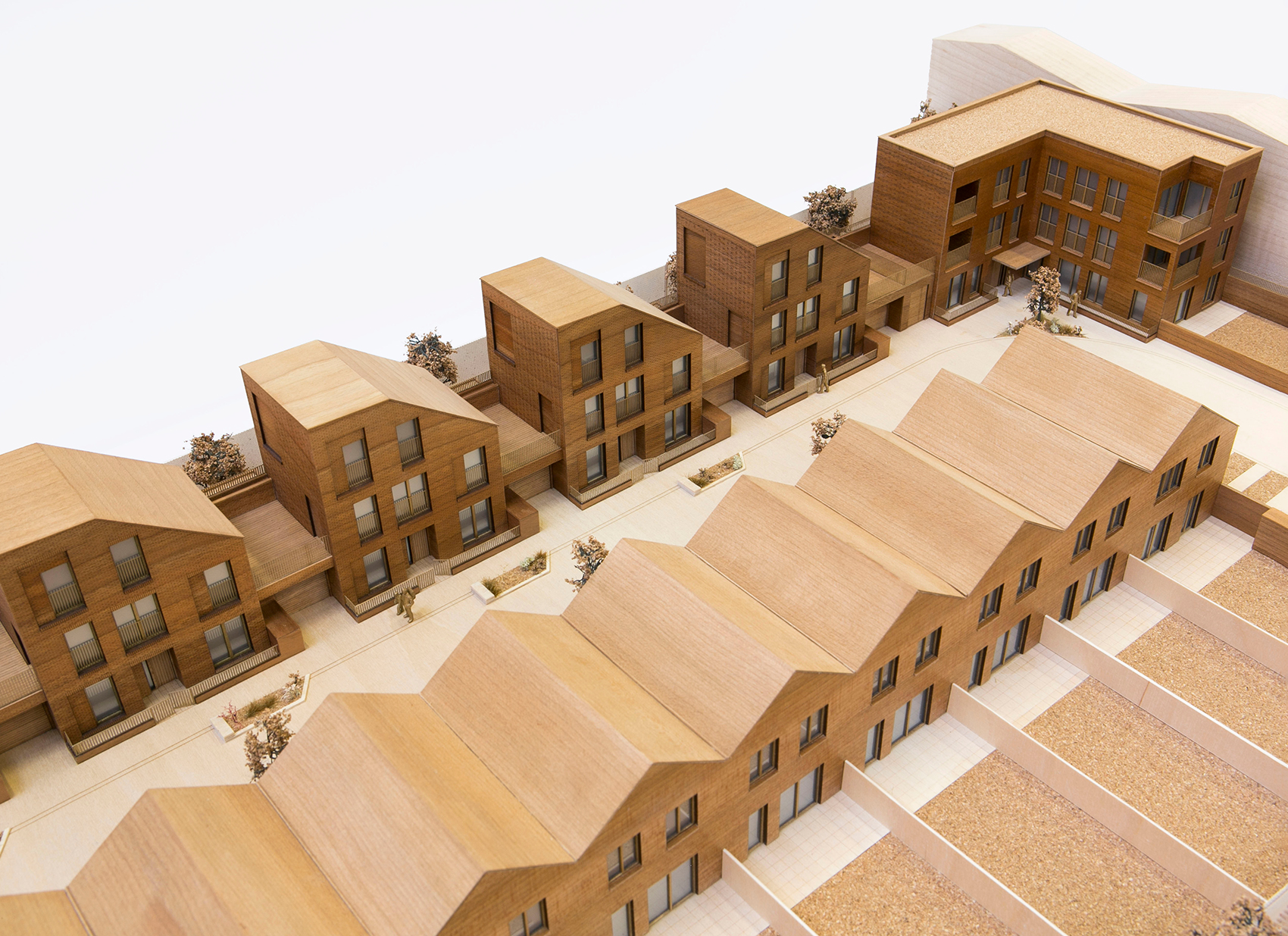 We collaborated with Maccreanor Lavington to create variety in built form and typology across the two terraces. The west terrace consists mainly of 2-storey houses, with 3-storey homes to the north, and provides a mix of family houses, maisonettes and courtyard apartments, while the eastern terrace is comprised of predominately