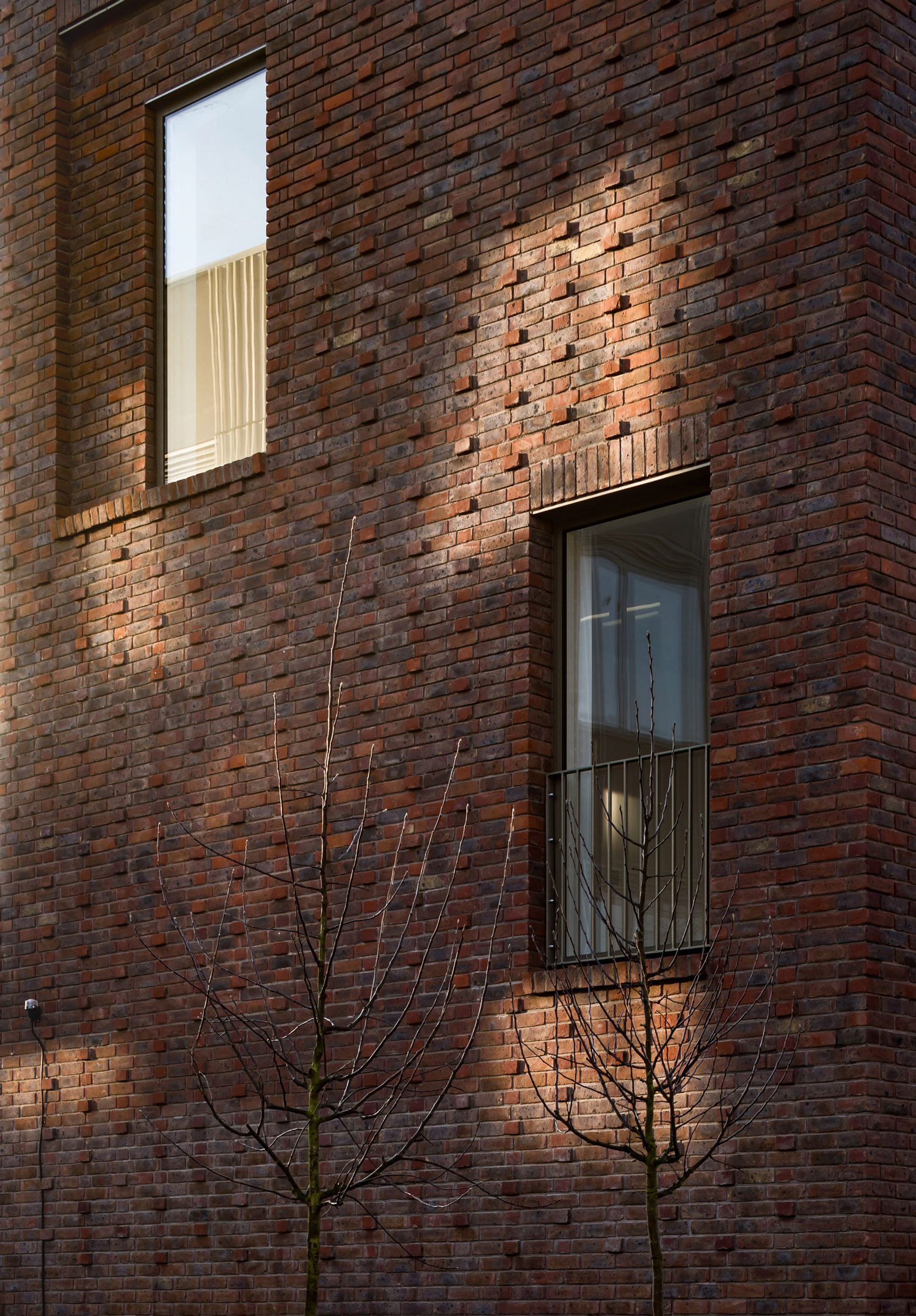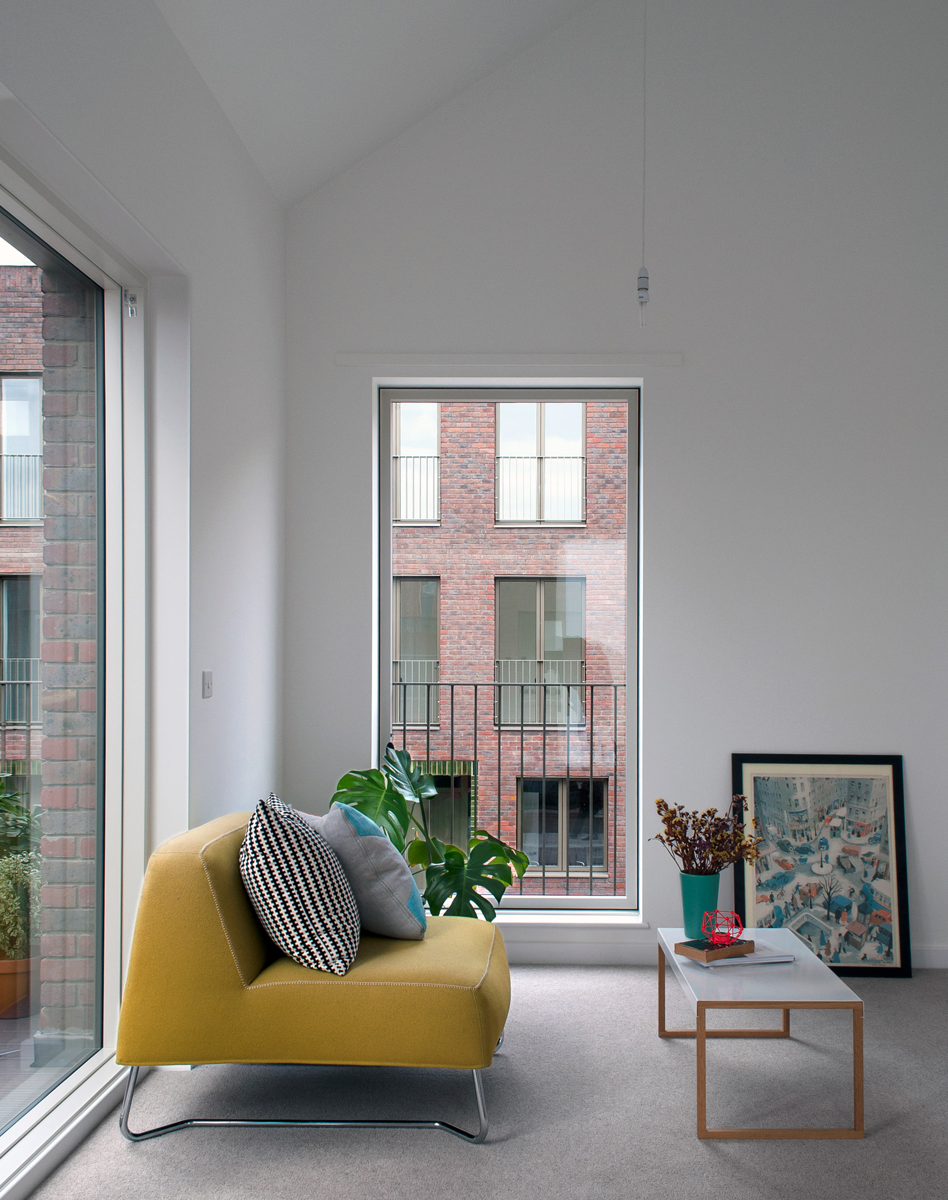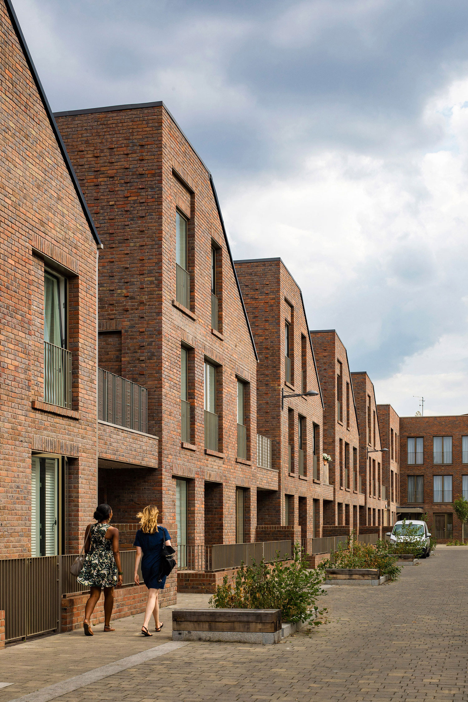 Owing to site restraints, the east terrace features a set of uniquely slim family homes that are orientated west to the street with private first floor terraces facing to the south, creating an arrangement where space is not compromised and no habitable rooms overlook the neighbouring school. Townhouses featuring pitched and mono-pitched roofs create an articulated and varied street profile, allowing daylight to flood the public realm. Internally, all homes are designed to be spacious and adaptable, with substantial floor-to-ceiling heights and ample natural light and ventilation.