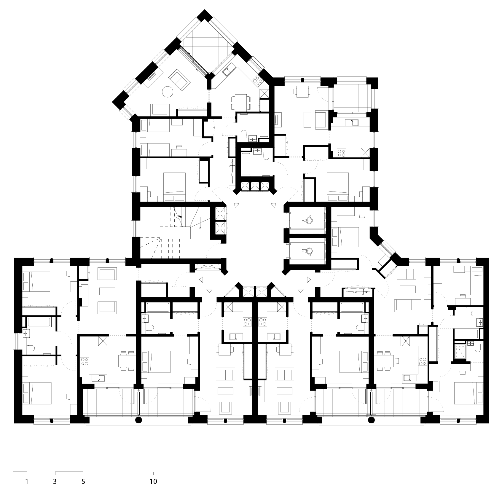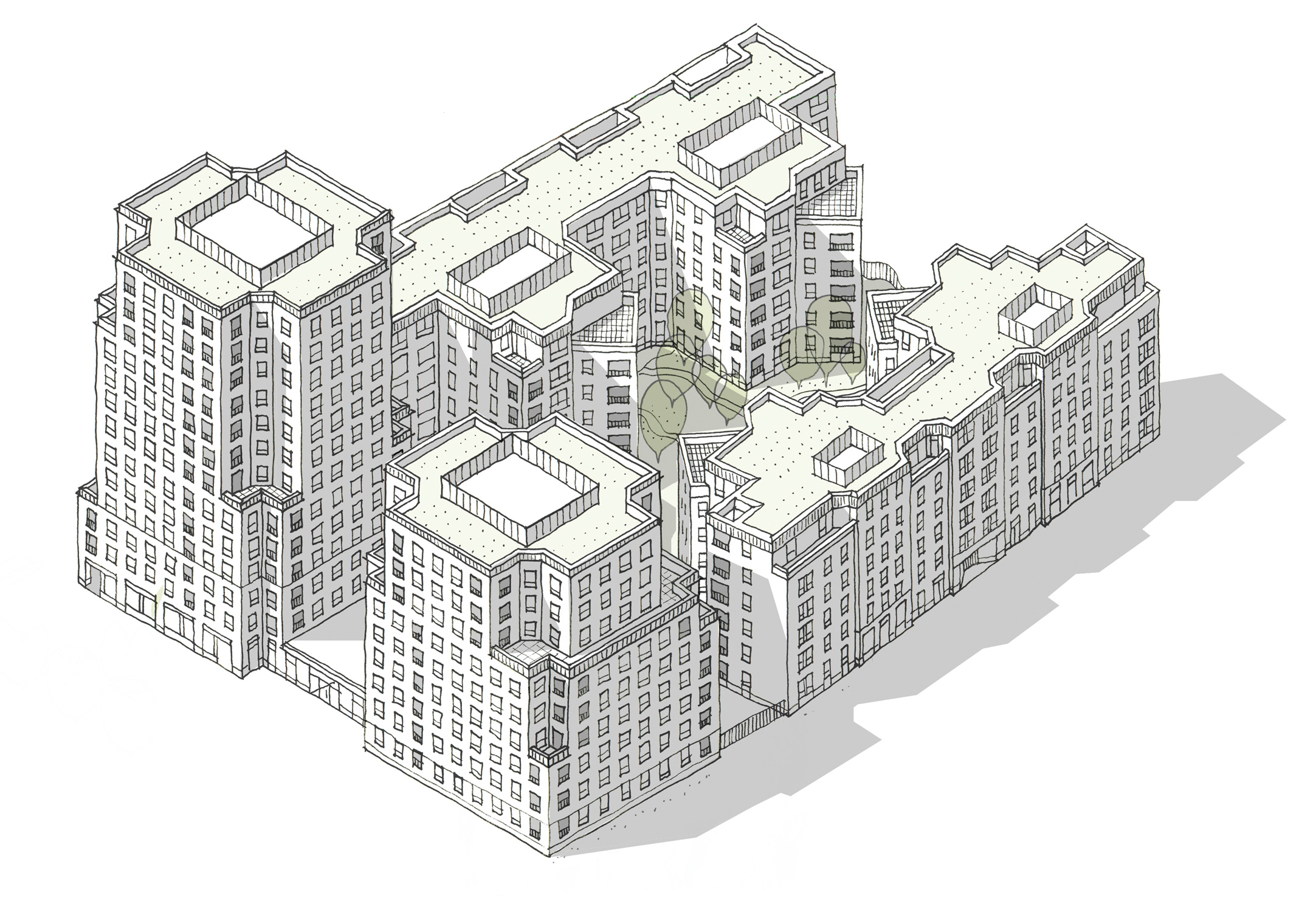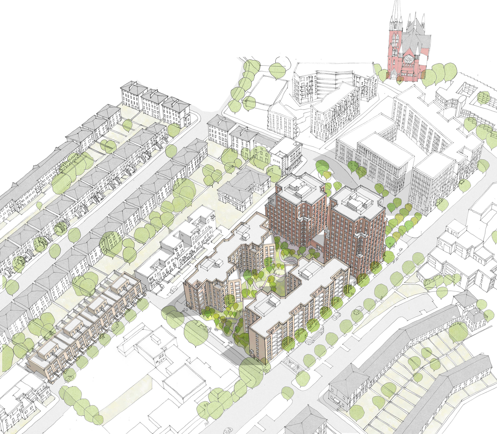 At the centre of the site, two mansion block buildings work with the taller elements to enclose a meandering communal landscape with a set of protrusions that extend out from the buildings on either side to enable an increased density and variety of living spaces through purposeful offsets and alignments.
