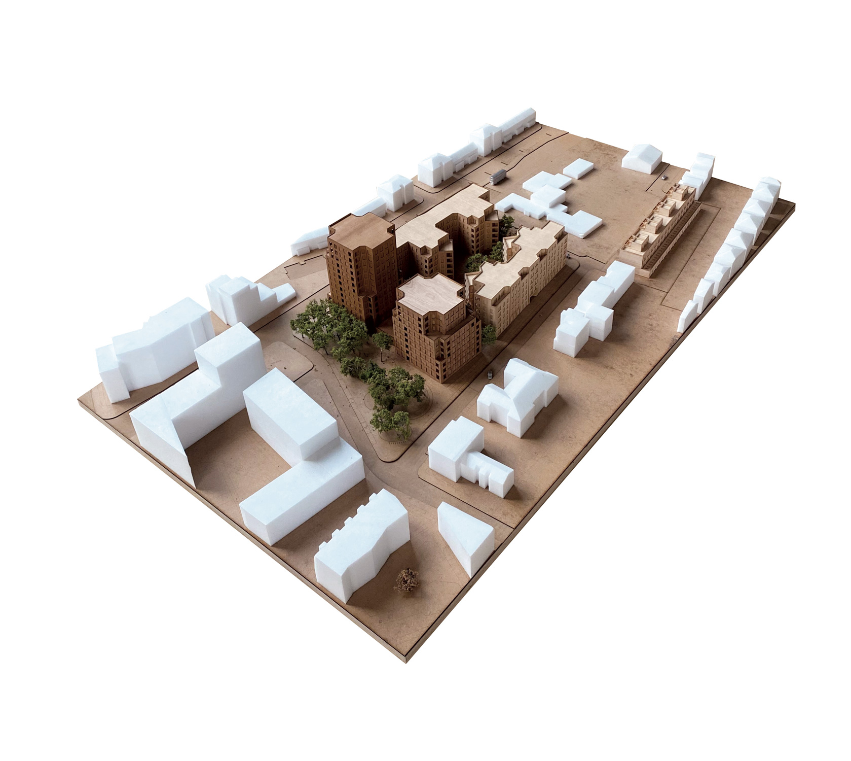 Our design approach first focused on how to optimise a 1ha site to provide spacious homes and outdoor green space. Working with the council and residents, we developed an outline design for a courtyard block, breaking it into free-standing elements; two mansion blocks and two towers, to bring more light into the depth of the plot. In this arrangement, geometries and massing is regularised and height focused towards Carlton Vale, a broad thoroughfare to the south and Cambridge Green a public space to the east.