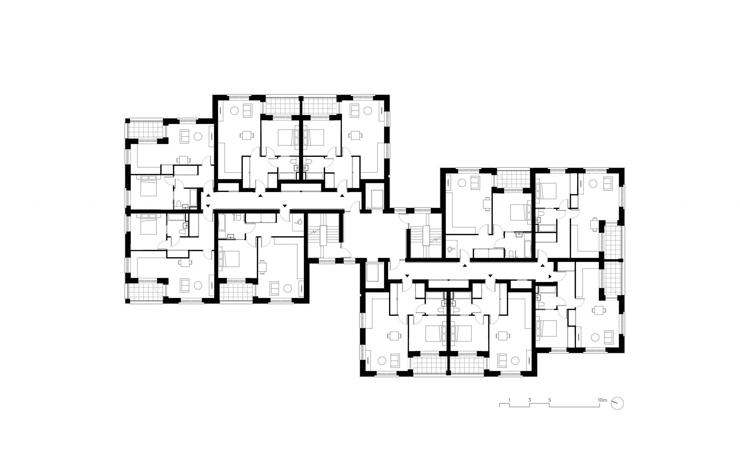 To the east, a building for older adults shares a similar material language and features individual architectural elements including centrally paired balconies that recall the character of nearby homes. Internal layouts are designed to promote a sense of comfort, safety and wellbeing for residents; communal entrances are arranged to frame views into an enclosed courtyard garden, and a triple-aspect communal lounge connects through to a shared outdoor terrace, promoting interactions with neighbours and the outdoors. Spacious family dwellings are contained within a block to the west; placed above a landscaped podium to negotiate a 4m level change and create a better relationship with the street. To reduce energy consumption and keep fuel bills low, the design incorporates a number of passive measures including thermally-efficient fabric and naturally ventilated spaces.