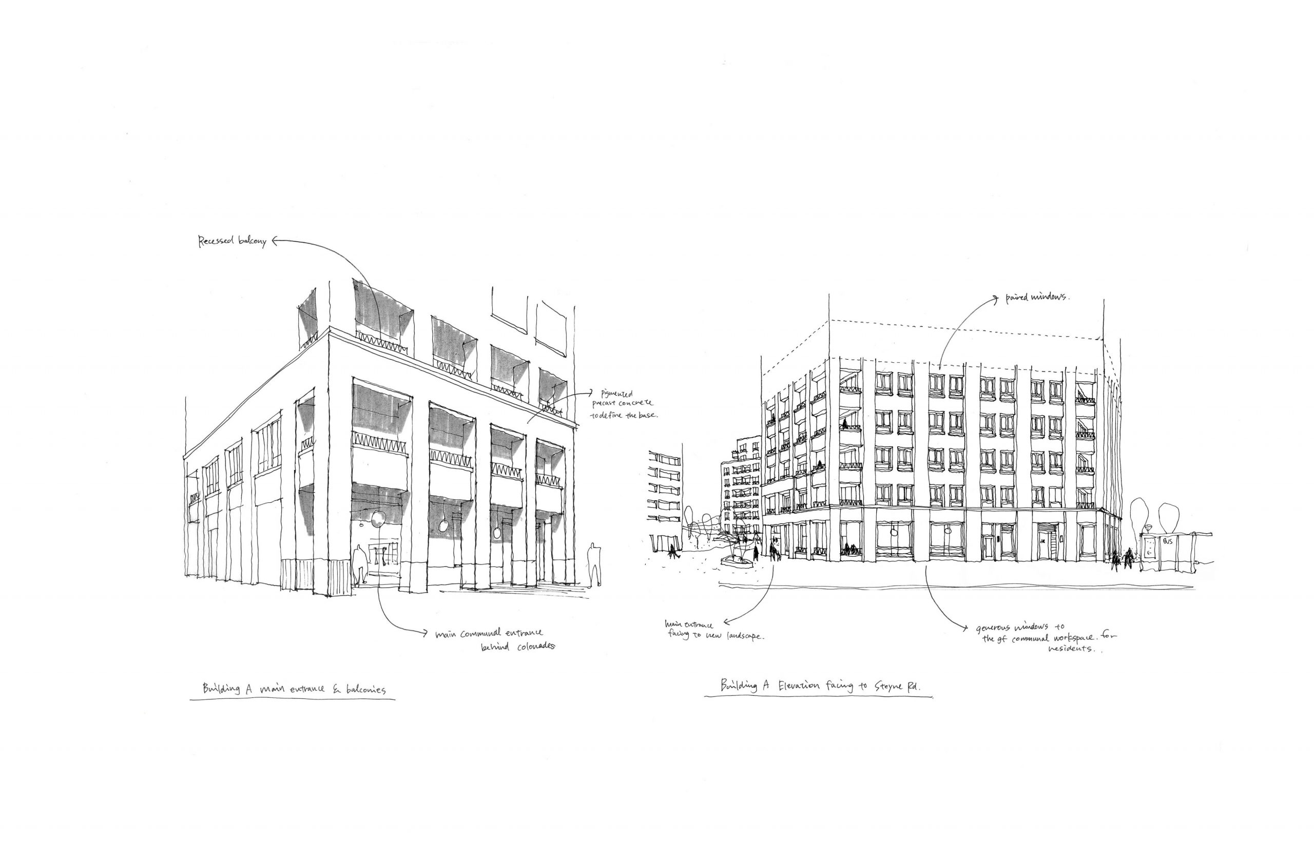 In addition to the creation of new homes, our designs have explored options to re-purpose the large undercrofts of the existing estate buildings with new civic uses to create a more active relationship with the ground floor and public realm. Across the site, new and retained buildings are united within a multi-generational play landscape featuring a network of connecting pedestrian paths and existing mature trees.