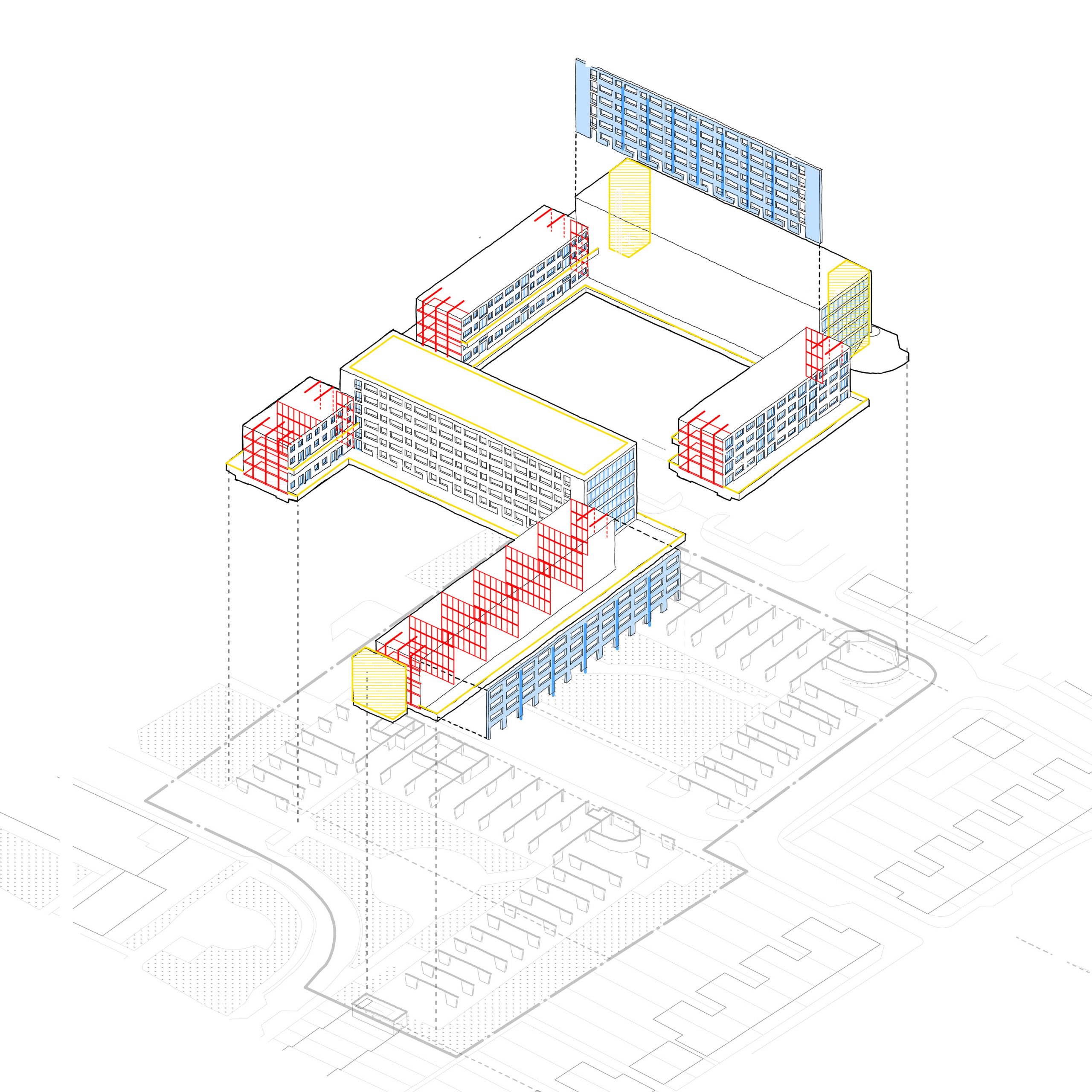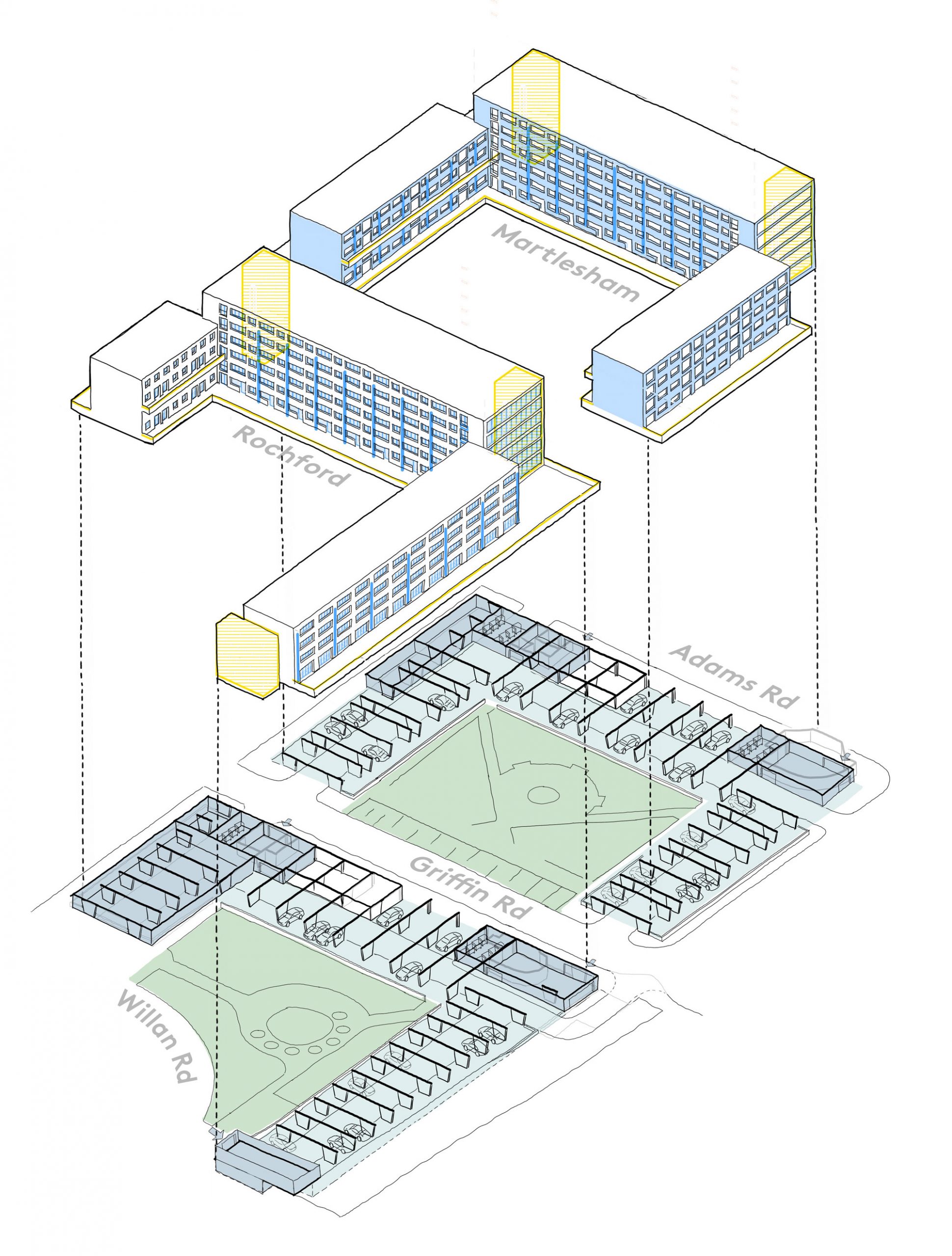Originally built in the 1960s, Martlesham and Rochford are two large-panel-system (LPS) buildings which have undergone significant alterations over the last three decades, resulting in buildings which are physically layered, poorly insulated and lack a coherent identity. Critically, these original buildings were also found to contain deep-rooted structural and material risks which, despite a long programme of remedial works, still require considered resolution to bring them up to standard.