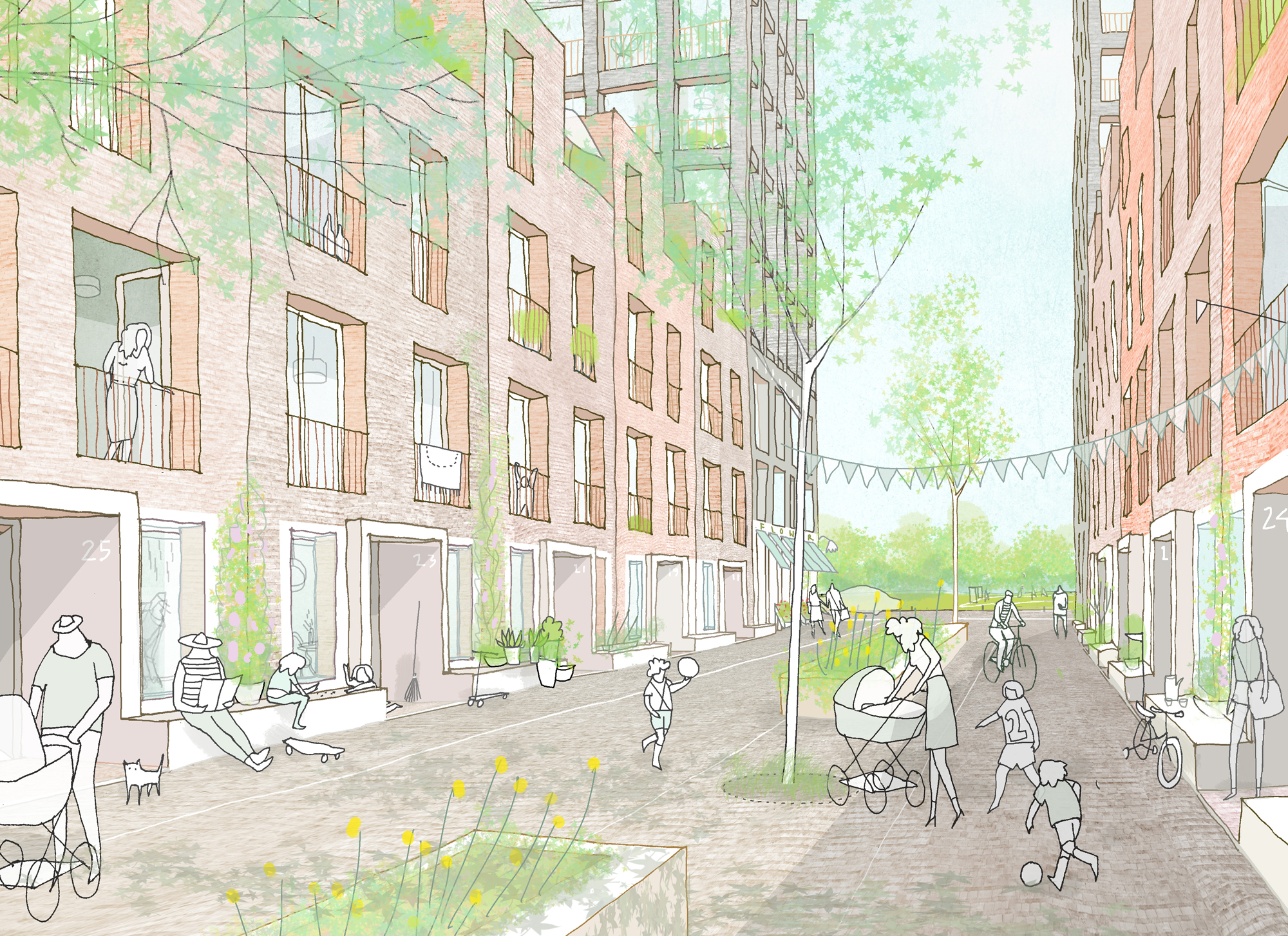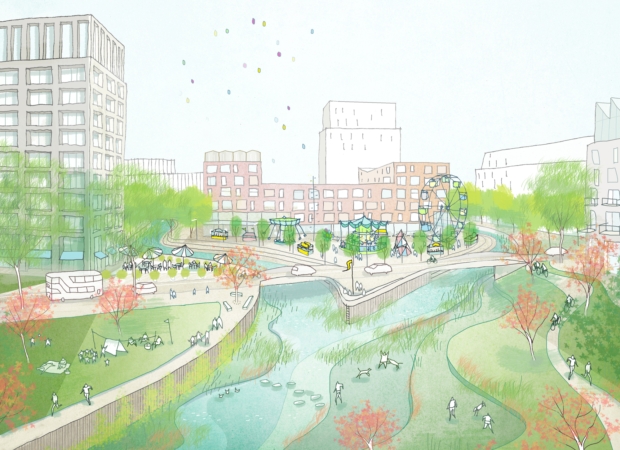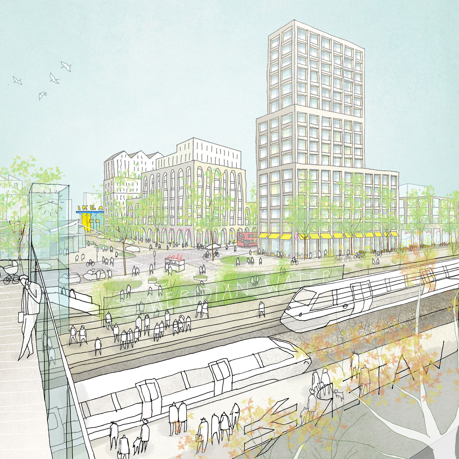 Our masterplan design is underpinned by a comprehensive, far-reaching and low-carbon movement network which will unite the physically fragmented site and connect into different area’s along the Lee Valley. An east-west Causeway provides the central spine of the masterplan and forges a important link from the new Meridian Water Station in the masterplan’s first phase to the west up to the Lee Valley Regional Park and opening up different neighbourhoods, civic squares and urban spaces along the way.