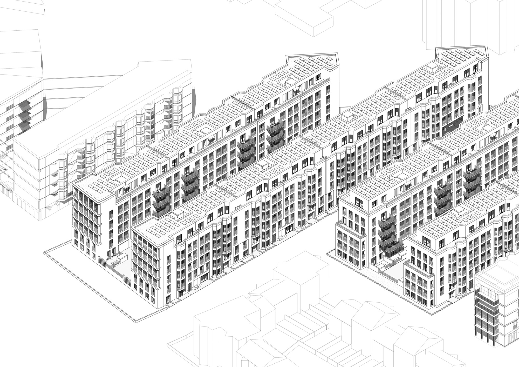 Our masterplan reconnects the existing blocks to the wider district and opens up sightlines to Hackney Downs through a clear network of north-south streets. At the same time, a unifying architectural language is established to tie the buildings together. Taking its cue from the adjacent townscape of large 3-storey Victorian terraces and nearby mansion blocks, the project introduces high-density housing at medium rise through a fine grain of evenly distributed alternating streets and courtyards. This familiar pattern creates a cohesive architectural landscape of parallel-block typologies that is maintained through eight linear rows across four paired arrangements.