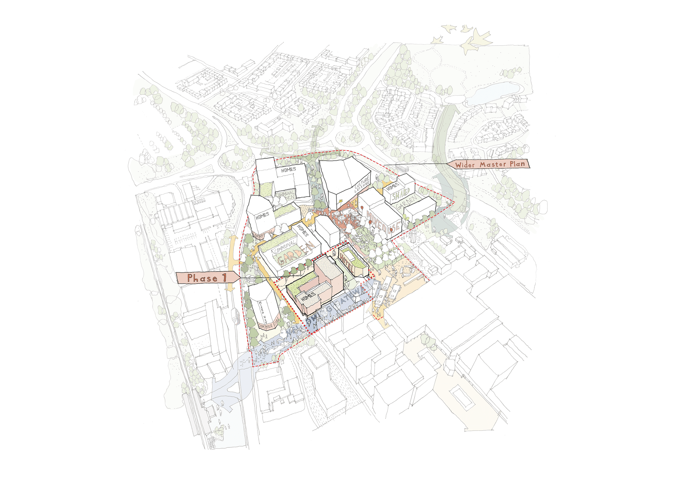 Engagement with The Selby Trust who manage the Selby Centre as well as local businesses and residents has been fundamental to our understanding of local requirements and in testing possible solutions and options. Through the strategic placement of homes, streets, public spaces, civic uses and community-focussed buildings across a variety of scales, our masterplan scenarios seek to overcome divisions between different urban areas and provide a framework to tie the neighbourhood together.