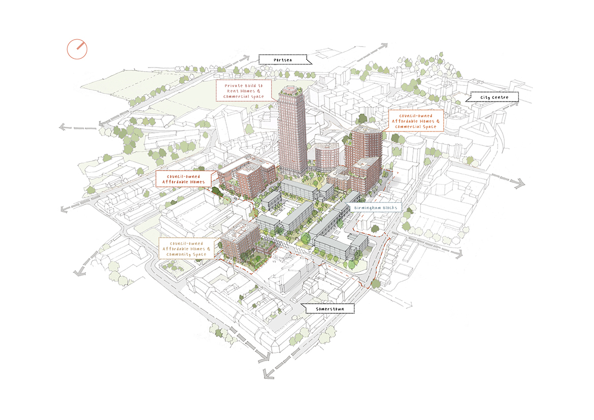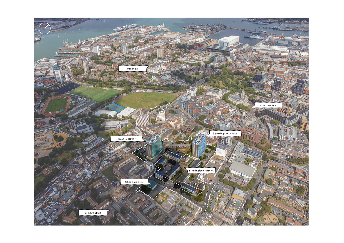 Somers Orchard creates a high-quality, sustainable, mixed-use urban neighbourhood for Portsmouth City Council (PCC). The project is an ambitious and pioneering community-led renewal of the estate that surrounds two structurally unsound, 1960s high-rise buildings, Horatia House and Leamington House. The scheme will provide 566 mixed tenure homes alongside wider public realm improvements which will meaningfully repair the urban fabric and reconnect the neighbourhood to its surroundings. The site is strategically important and prominently situated on the edge of the city centre to the northwest of Somerstown in Portsmouth, Hampshire. The area was heavily bombed during the Second World War which resulted in a large amount of post-war redevelopment that is not in keeping with the diverse and vibrant architectural character of wider Somerstown. The site borders King Street Conservation Area to the south and the Terraces Conservation Area to the northwest, both of which showcase original Victorian and Georgian character.