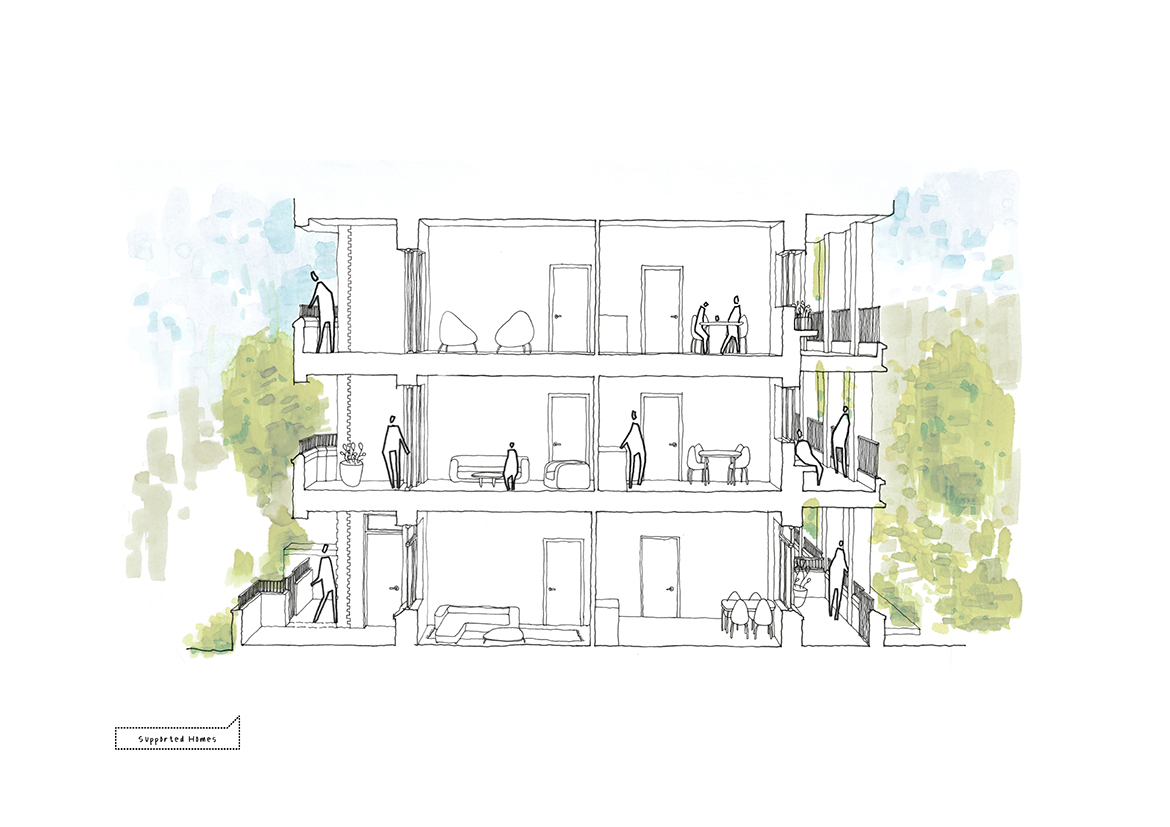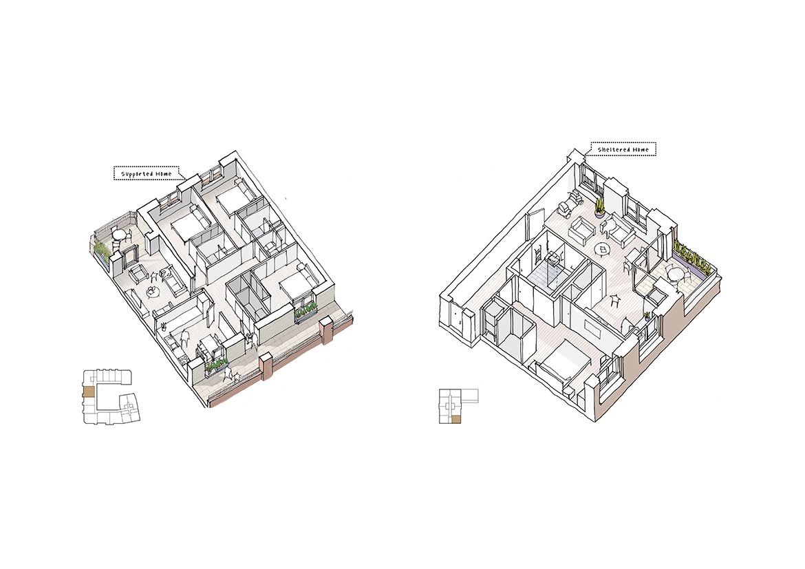 Axonometric view of supported and sheltered homes