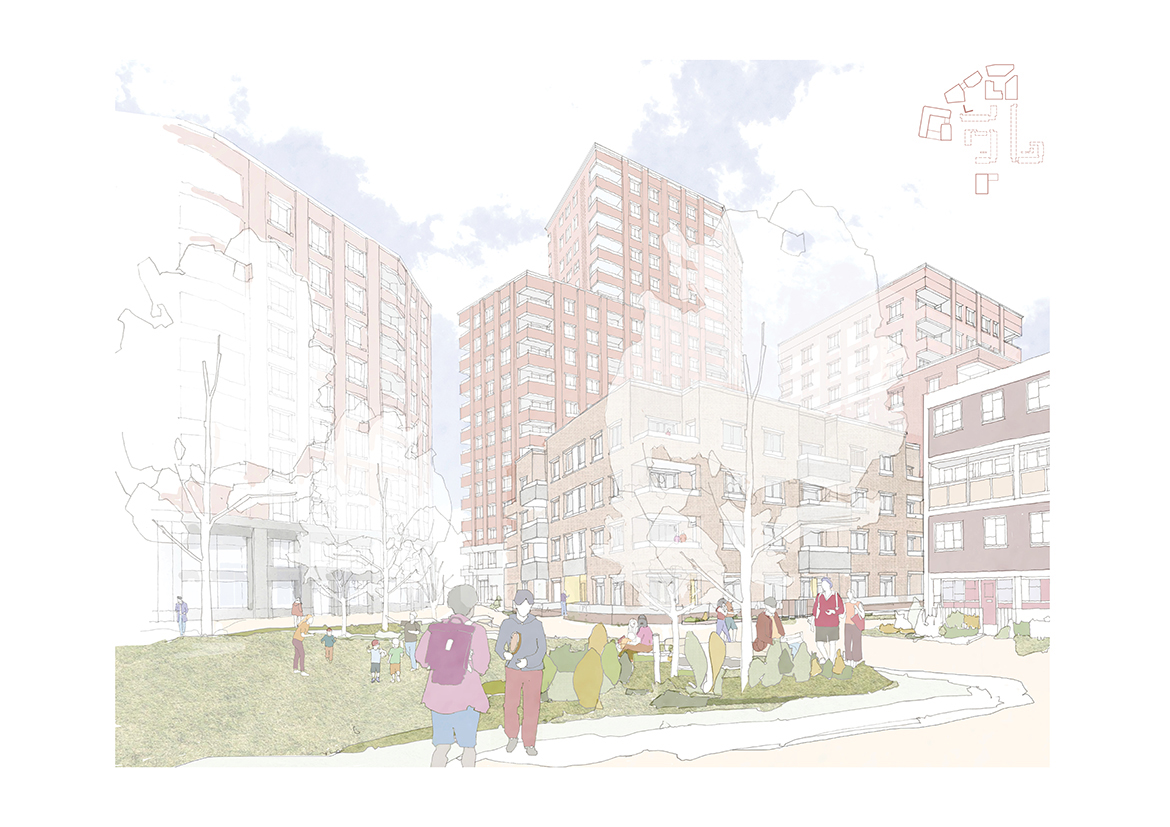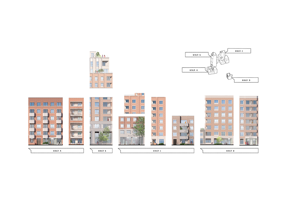Across the neighbourhood, a clear hierarchy of massing and well-articulated composition of buildings contribute to the urban townscape and frame views approaching the site. Character areas within the new neighbourhood help to define subtleties and variations in the architecture, material palette and details of the buildings as well as the public realm strategies. The scheme is knitted together by a multi-layered and seasonally vibrant landscape, rooted in improving health and wellbeing with a variety of inclusive and playable open spaces.