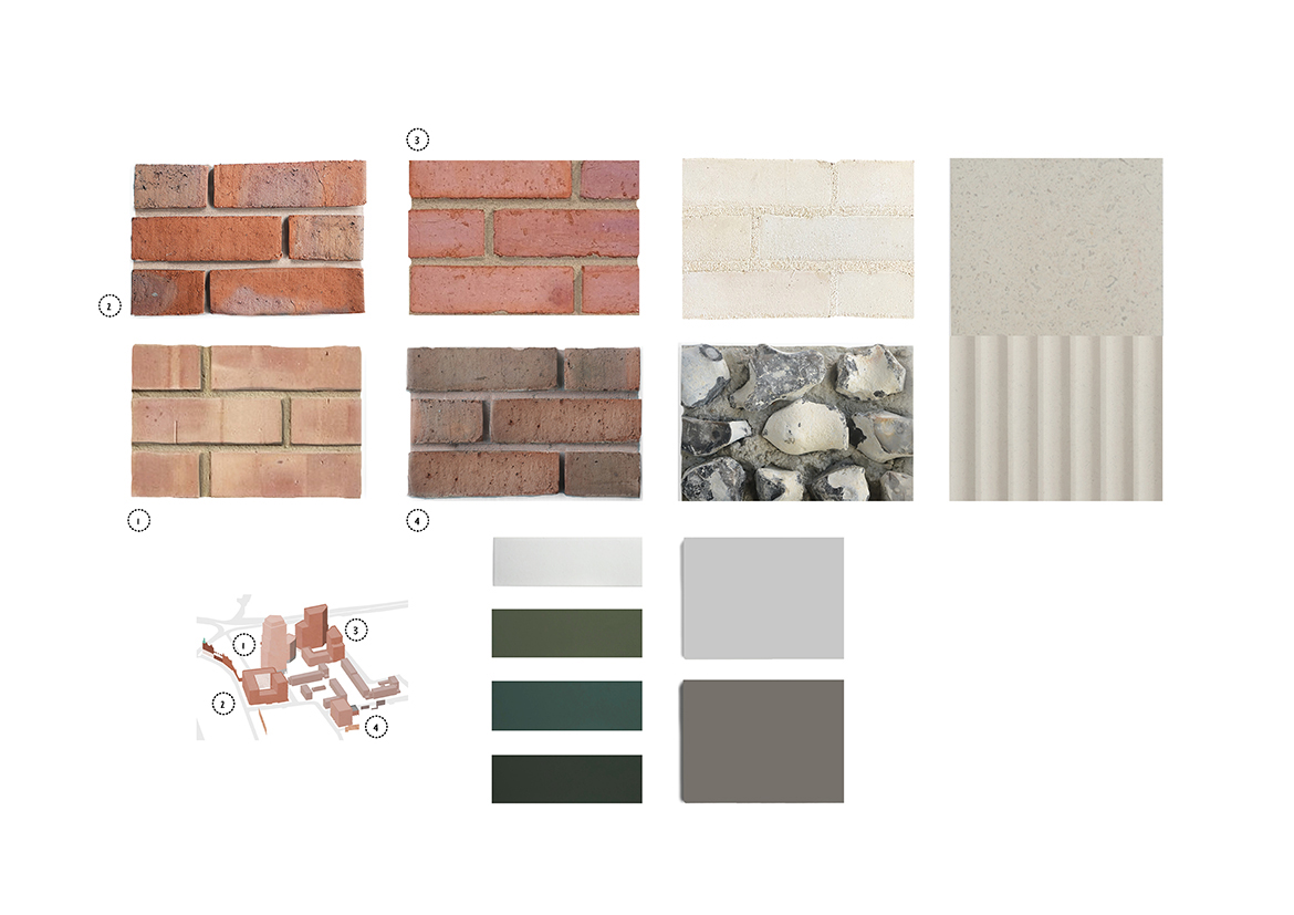 Brick tones range from pink-buff and pink-red to a traditional red and light brown-buff. A white-buff brick is used in the galleries, as well as inset balconies to give a greater sense of light in these spaces, a technique borrowed from neighbouring Victorian courtyard blocks. Metalwork tones are a unifying lighter tone to residential windows and a darker warm bronze-grey to communal entrance doors and all ancillary spaces. A range of natural-toned, green glazed bricks give emphasis to communal entrances and provide blocks with a distinct identity, reflective of the landscape-led approach to the masterplan.