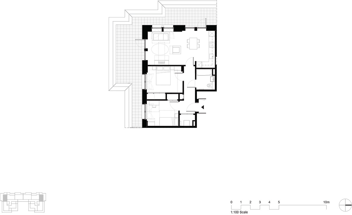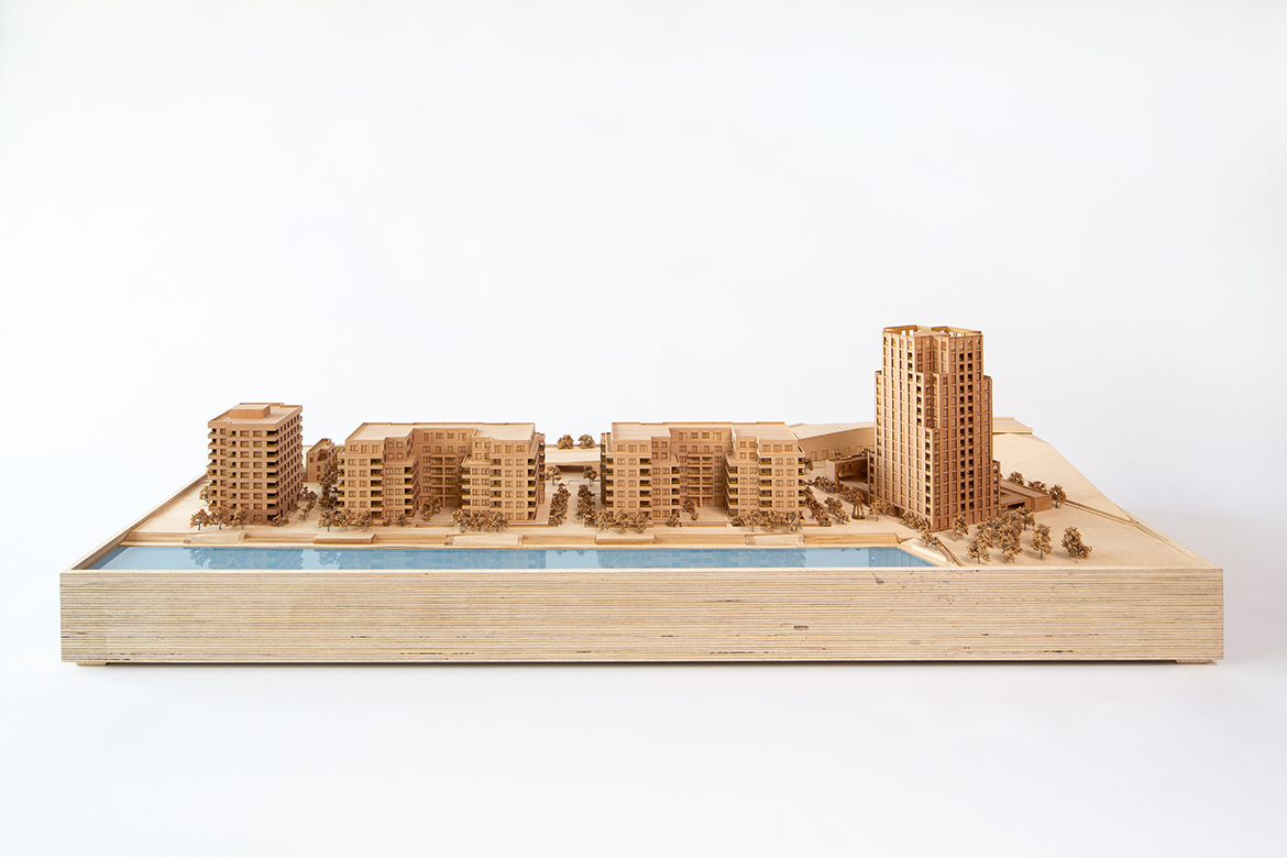 Bookending the site are two taller urban blocks, providing an appropriate step-up to address the urban infrastructure that wraps around the scheme; to the south, an 9-storey block is articulated with cut-away corners and recessed balconies creating light-filled dwellings with sheltered outdoor space overlooking the lake, while to the north, a 17-storey landmark building is positioned to mark the edge of the large site. As this block ascends, a distinctive silhouette is sculpted out by a series of considered cut aways at different levels to visually break-down its massing and create a mix of 1, 2 and 3-bed dwellings.