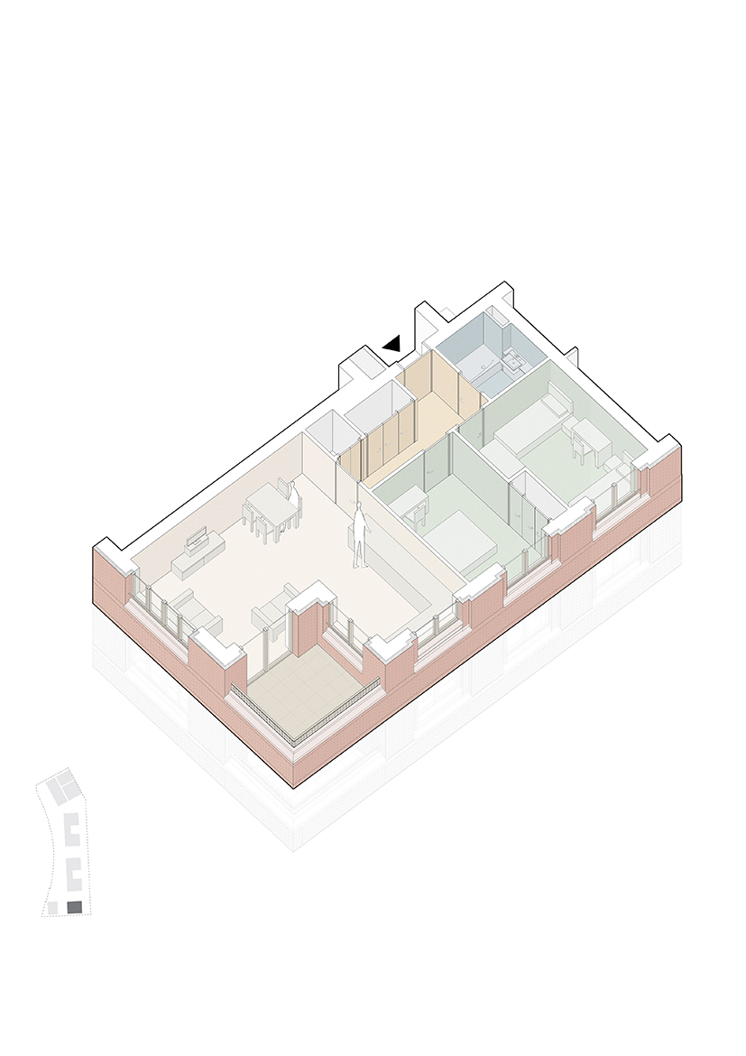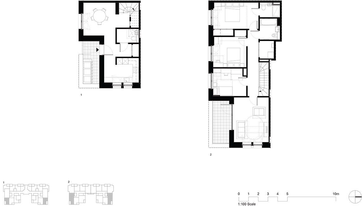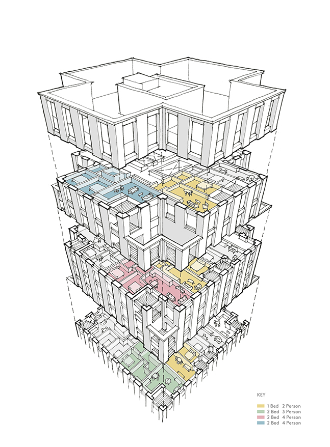 Occupying the centre of the site are two ‘C’ shaped courtyard mansion blocks containing landscaped gardens at their centre which both residents and the public can use. Taking their cue from the historic Peabody mansion buildings, the blocks are carefully articulated to increase the number of dual-aspect dwellings with adjoining private terraces and balconies.
