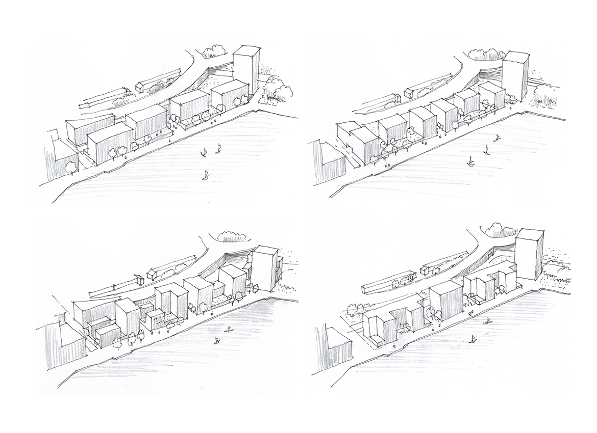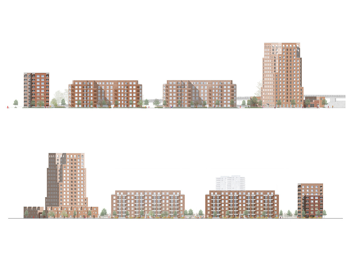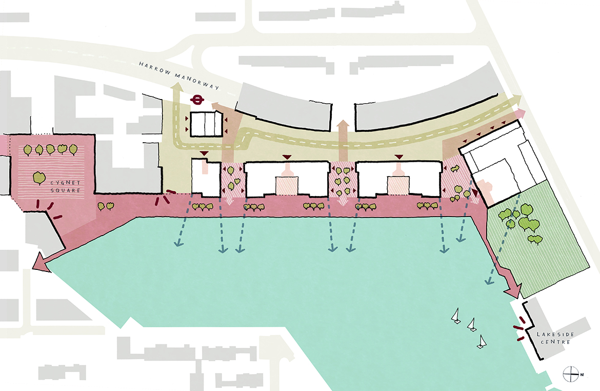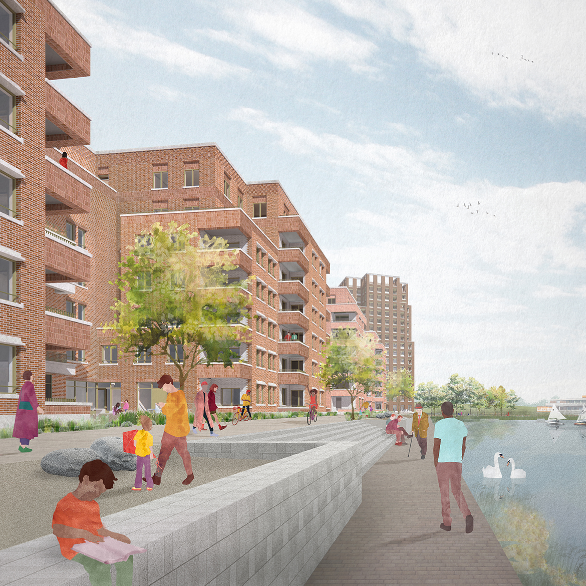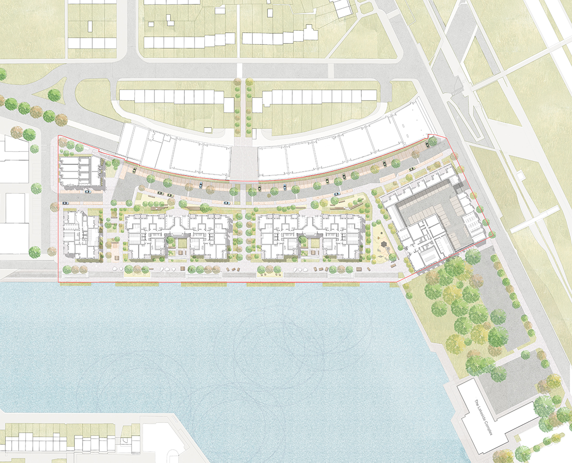 This largely pedestrianised site creates a series of gardens, swales and play spaces linking to a generous public promenade which will allow people to enjoy the waterfront more easily. Using the lake as a focal point, the neighbourhood is formed of a series of elegant brick-built residential buildings configured to front onto the water and provide elevated views from the living spaces.