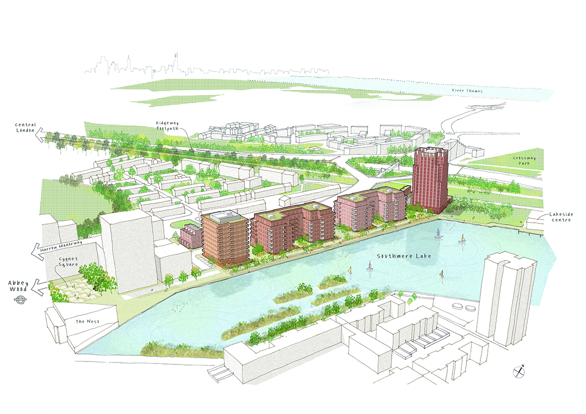Located on the western edge of Southmere Lake in south-east London at the intersection of major urban infrastructure, our proposals for South Thamesmead (Phase 2) form part of the wide reaching and ambitious masterplan strategy shaping this part of the city. Our scheme creates a mixed-tenure neighbourhood of 329 homes, including 59 affordable rent homes for returning Thamesmead residents reflecting the qualities and characteristics of its varied setting.
