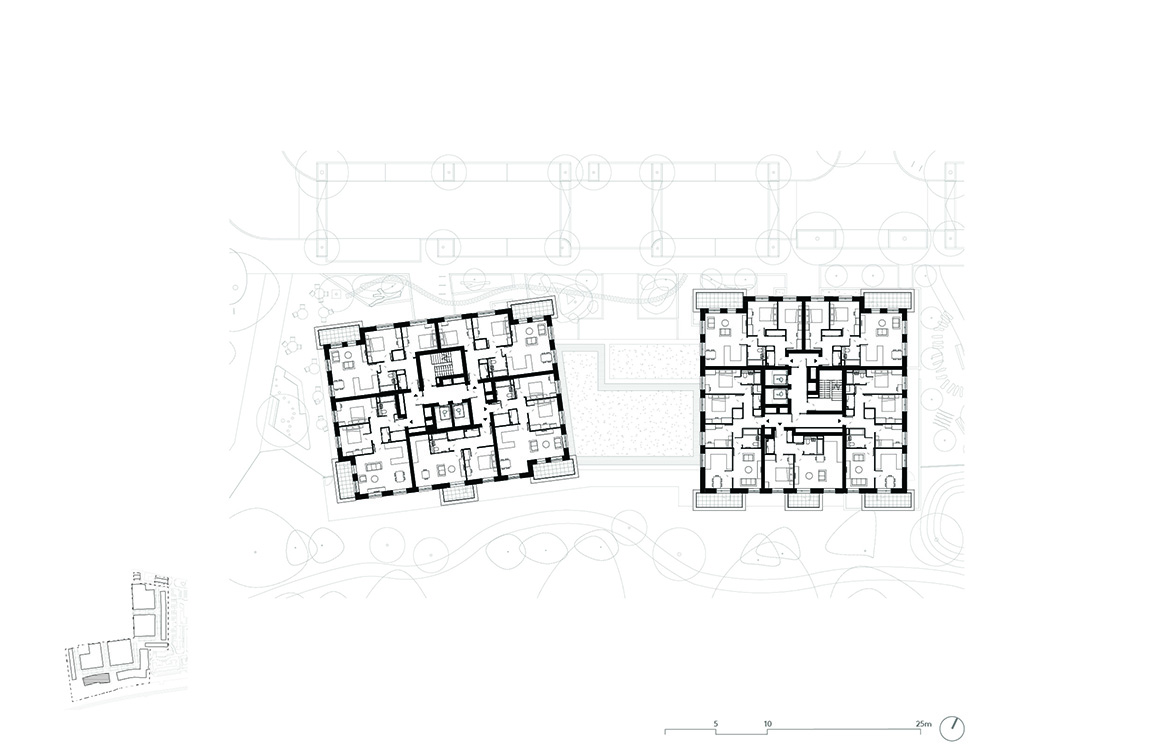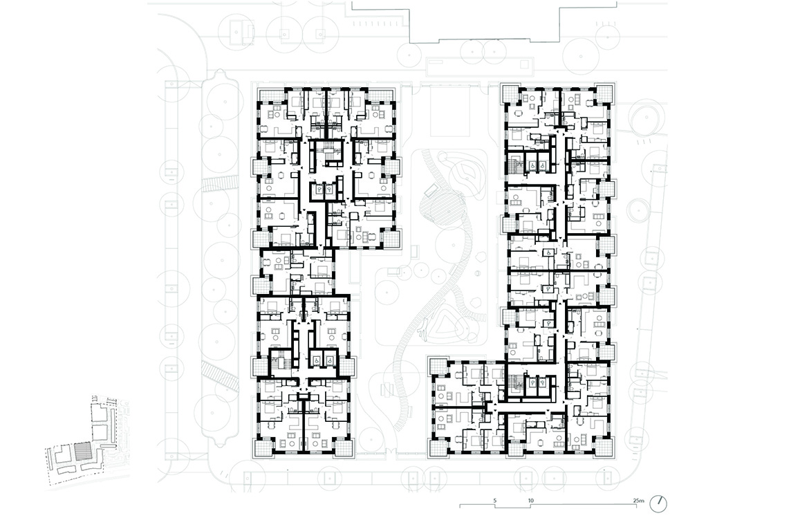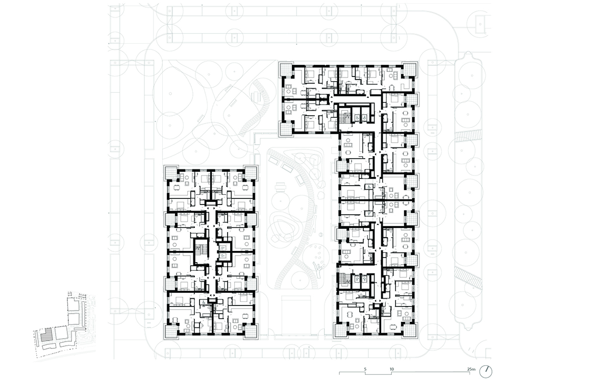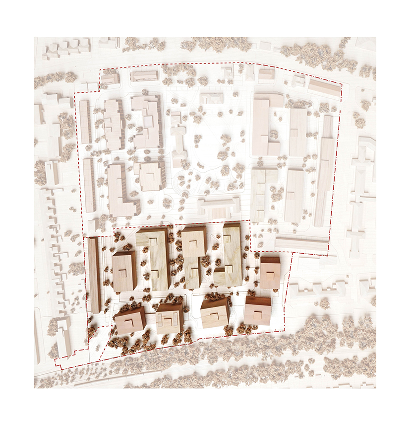 The new buildings of Phases 1B & 2 range in height from three to nine storeys, changing in type, scale and form across the site, in response to the varied site conditions. A row of affordable family houses along the western boundary address the terraced streets beyond, continuing the neighbourhood street established in the first phase and framing the landmark Water Tower. Taller courtyard mansion buildings towards the centre of the plan front on to the central Peace Garden, with generous shared landscape gardens. To the south of the site, villa buildings adopt a looser arrangement, optimising views through the beautiful natural setting of the adjacent protected (SINC) woodland and maximising dual aspect homes.