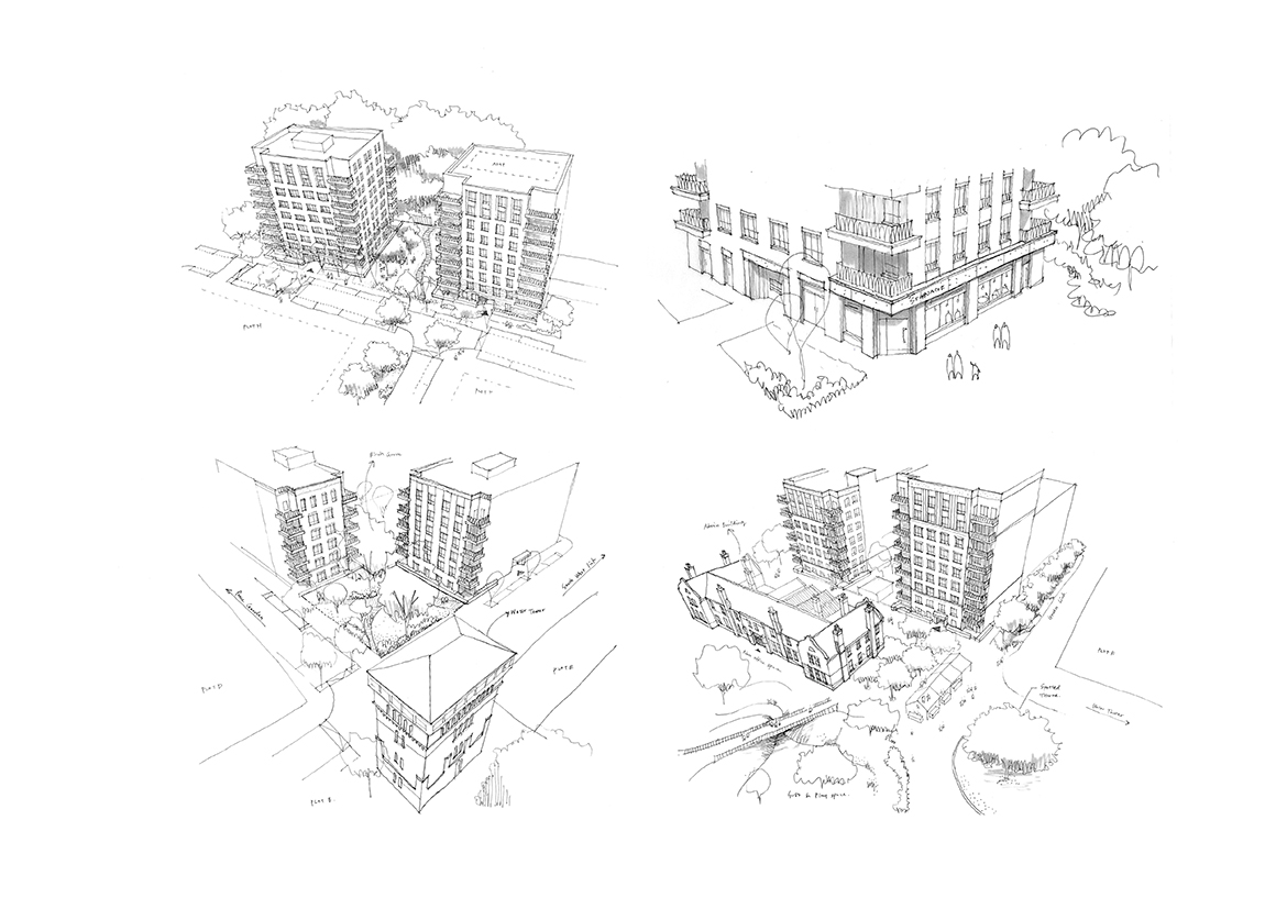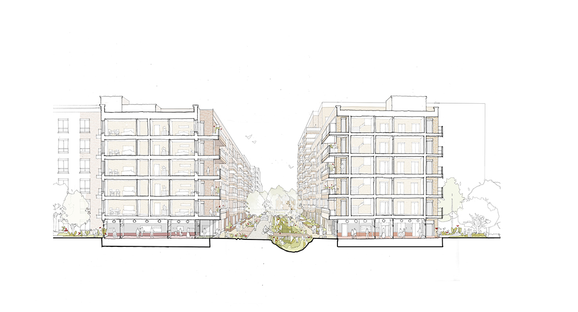 In the site’s southwestern corner, a public square and commercial unit greet a new pedestrian and cycle through-route to Warwick Gardens and the high street amenities and transport links of Green Lanes beyond. This new route will provide permeability through this previously isolated hospital site for the wider community, ensuring that the new development is an integrated part of the city as well as improving neighbourhood-wide active travel connections.