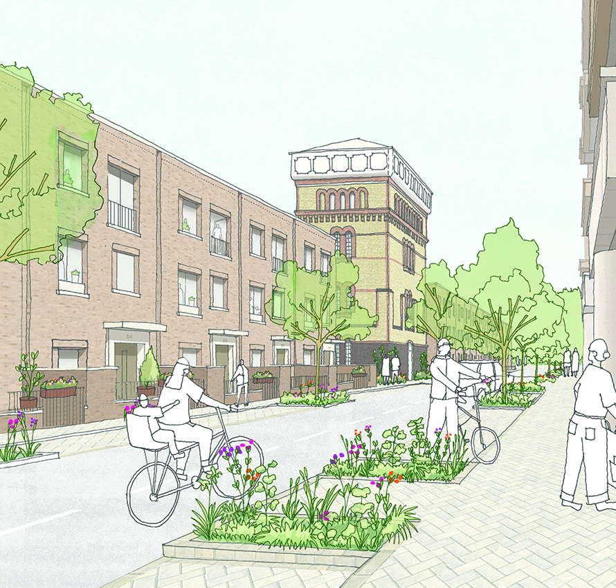 A substantial 73% of the new homes in Phase 1B & 2 will be affordable, including 58 homes for a local Community Led Housing group. Completing the southern half of the overall masterplan, the nine new apartment buildings and fourteen family houses will sit alongside restored Victorian-era hospital buildings including the Water Tower and Admin Building. All buildings are united through a complementary brickwork palette and architectural language, inspired by the distinctive character of the Victorian hospital and surrounding area, ensuring a fully tenure-neutral approach and continuing the ambition of the first phase as set out in the approved Outline Masterplan and Design Code.